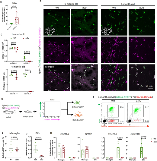 Fig. 1 Brain-associated DCs are absent in the id2a-deficient mutants. (A) RT-PCR shows the expression levels of id2a in the ccl34b.1+ (GFP+DsRedx+) and ccl34b.1− (GFP−DsRedx+) cells sorted from 4-month-old TgBAC(ccl34b.1:eGFP);Tg(mpeg1.1:DsRedx) fish. n=7 for each group. (B,C) Representative images (B) and quantification (C) of the density of GFP+DsRedx+ and GFP−DsRedx+ cells in the transverse midbrain sections of 1-month-old and 4-month-old TgBAC(ccl34b.1:eGFP);Tg(mpeg1.1:DsRedx) WT or id2a mutant fish. n≥3 for each genotype. (D) Schematic of whole-brain FACS analysis of 4-month-old TgBAC(ccl34b.1:eGFP);Tg(mpeg1.1:DsRedx) WT fish and id2a mutants. ccl34b.1+mpeg1.1+ (DsRedx+eGFP+) and ccl34b.1−mpeg1+ (DsRedx+eGFP−) cells represent microglia and brain-associated DCs in WT, respectively. (E-G) Representative FACS plot (E) and the proportion (F,G) of ccl34b.1+mpeg1.1+ (DsRedx+eGFP+) and ccl34b.1−mpeg1+ (DsRedx+eGFP−) cells are presented as a percentage of total brain cells in TgBAC(ccl34b.1:eGFP);Tg(mpeg1.1:DsRedx) WT or id2a mutant brains. n=6 for WT and n=7 for id2a mutants. (H) RT-PCR shows the expression levels of microglia marker genes (ccl34b.1, apoeb) and brain-associated DC marker genes (ccl19a.1, siglec15l) in ccl34b.1+mpeg1.1+ and ccl34b.1−mpeg1.1+ cells collected from the brains of 4-month-old TgBAC(ccl34b.1:eGFP);Tg(mpeg1.1:DsRedx) WT or id2a mutants. n=6 for each genotype. Data are mean±s.d. Unpaired Student's t-test with Welch's correction.