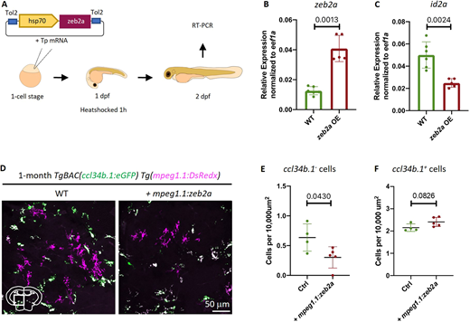 Fig. 5 zeb2a inhibits DC development through repressing id2a expression. (A) Experimental design of zeb2a overexpression. The embryos injected with hsp70:zeb2a constructs and Tol2 transposase (TP) mRNA were heat-shocked at 1 dpf to induce the zeb2a expression. The heat-shocked embryos were collected at 2 dpf for RT-PCR analysis. (B,C) RT-PCR shows the expression levels of zeb2a and id2a in the whole embryo of 2 dpf WT and zeb2a-overexpressed fish. n=4 for each group. (D-F) Representative images (D) and quantification of the ccl34b.1+mpeg1.1+(GFP+DsRedx+) (F) and ccl34b.1−mpeg1.1+ (GFP−DsRedx+) cells (E) and their density in the transverse midbrain sections of 1-month-old TgBAC(ccl34b.1:eGFP);Tg(mpeg1.1:DsRedx) WT or mpeg1.1:zeb2a-injected fish. n=4 and 5 for WT and mpeg1.1:zeb2a-injected fish, respectively. Data are mean±s.d. Unpaired Student's t-test with Welch's correction