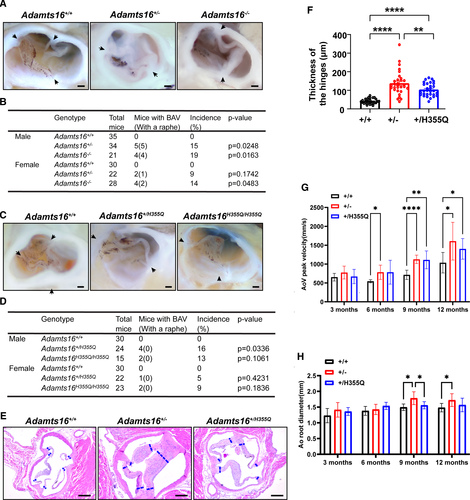Fig. 3 Phenotypes of both Adamts16+/- and Adamts16+/H355Q mice showing the occurrence of BAV and progressive aortic valve disease. A, Anatomic analysis of aortic valves in Adamts16+/+, Adamts16+/-, and Adamts16-/- mice. The black arrow indicates commissures. Scale bars=1 mm. B, Percentage of bicuspid aortic valve occurrence in Adamts16+/+, Adamts16+/-, and Adamts16-/- mice. P values were calculated using the Fisher exact test . C, Anatomic analysis of aortic valves in Adamts16+/+, Adamts16+/H355Q, and Adamts16H355Q/H355Q mice. The black arrow indicates commissures. Scale bars=1 mm. D, Percentage of bicuspid aortic valve occurrence in Adamts16+/+, Adamts16+/H355Q, and Adamts16H355Q/H355Q mice. P values were calculated using the Fisher exact test. All mice used for aortic valve anatomic analysis were at 3 to 12 months. E, Representative hematoxylin and eosin–stained aortic valve images in mouse transverse sections at 12 months of age. The blue dashed lines represent regions of quantification for thickness. Scale bars=200 µm. F, Quantification of aortic valve thickness reveals significant enlargement of the aortic valve leaflet hinges in Adamts16+/+, Adamts16+/-, and Adamts16+/H355Q mice (n=5 mice for each genotype; each mouse has 6 valve hinge measurements). ****P<0.0001, mean±SEM, using 1-way ANOVA followed by the Tukey post hoc test. G, Quantification of aortic valve peak velocities. Aortic valve peak velocities were significantly increased at 9 and 12 months in Adamts16+/- and Adamts16+/H355Q mice, whereas no increase was observed in Adamts16+/+ control littermates (n=8 mice for each genotype at each stage, mean±SEM, using mixed-effects ANOVA followed by the Tukey post hoc test). H, Quantification of aortic root diameter. Aortic root diameter progressively increased in 9- and 12-month-old Adamts16+/- mice, whereas no obvious increase was observed in Adamts16+/H355Q mice and Adamts16+/+ control littermates (n=8 mice for each genotype at each stage, mean±SEM, using mixed-effects ANOVA followed by the Tukey post hoc test). ****P<0.0001; ***P<0.001; **P<0.01; *P<0.05. ADAMTS indicates a disintegrin and metalloproteinase with thrombospondin motifs; Ao root, aortic root; AoV, aortic valve; and BAV, bicuspid aortic valve.