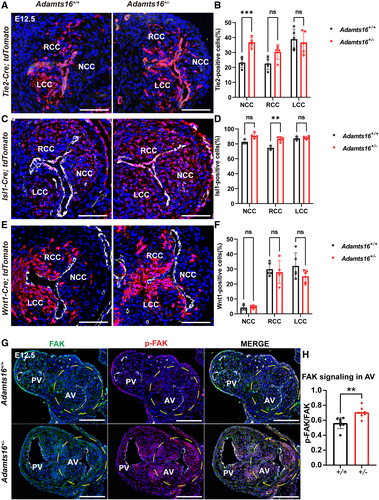 Fig. 5 The effects of Adamts16 deficiency on the activities of each cell lineage during the development of the aortic valve. A through F, Fate mapping of the endothelial ( A), neural crest ( C), and second heart field ( E) lineage cells was performed respectively in the aortic valves of both Adamts16+/+ and Adamts16+/- embryos at E12.5. Transversal sections were immunoassayed with PECAM1 (in white) and DAPI (in blue). Scale bars=100 µm. Quantification of endothelial-derived cells demonstrates the increased cell numbers in the noncoronary cusp in Adamts16+/- (n=5) compared with Adamts16+/+ littermates (n=5; **P<0.01; B). Quantification of second heart field–derived cells demonstrates increased cell numbers in the noncoronary and right coronary cusps in Adamts16+/- mice (n=5) compared with Adamts16+/+ littermates (n=3). **P<0.01; ****P<0.0001 ( D). Quantification of neural crest–derived cells demonstrates that there was no significant difference in cell number in 3 individual cups of Adamts16+/- (n=5) compared with Adamts16+/+ littermates (n=5) ( F). In B, D, and F, Statistical analysis was performed using 2-way ANOVA followed by the Šidák multiple comparisons test. G, Immunostaining of FAK and phospho-FAK (Tyr397) in aortic valves of Adamts16+/+ and Adamts16+/- embryos at E12.5. Scale bars=100 µm. H, Quantification of phospho-FAK (Tyr397) staining (n=8 for each genotype). P values were calculated using the Student t test. ADAMTS indicates a disintegrin and metalloproteinase with thrombospondin motifs; AV, aortic valve; LCC, left coronary cusp; NCC, noncoronary cusp; PV, pulmonary valve; and RCC, right coronary cusp.