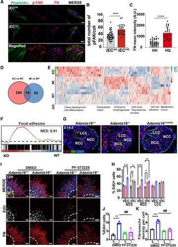 Fig. 6 ADAMTS16 deficiency leads to hyperproliferation of valve mesenchymal cells and upregulation of the FAK signaling pathway. A, Immunostaining of phospho-FAK (Tyr397, red), FN (magenta), and phalloidin (green) in iPSC-ECH/H and iPSC-ECH/Q. Scale bars=20 µm. B, Quantification of phospho-FAK (Tyr397) staining in iPSC-ECs. P values were calculated using the Student t test (n=48 for iPSC-ECH/H and n=28 for iPSC-ECH/Q; ****P<0.0001). C, Quantification of FN staining in iPSC-ECs. P values were calculated using the Student t test (n=25 for iPSC-ECH/H and n=27 for iPSC-ECH/Q). ****P<0.0001. D, Venn diagram summarized the 14 common differentially expressed genes (DEGs) among Adamts16+/+, Adamts16+/-, and Adamts16+/H355Q mice. A total of 250 DEGs were identified between Adamts16+/- and Adamts16+/+ mice, and 83 DEGs were discovered between Adamts16+/H355Q and Adamts16+/+ mice. E, Heatmap with cluster and gene set enrichment analysis (GSEA) of DEGs with main biological processes involved in each cluster. F, GSEA of positive regulation of the focal adhesion signaling pathway in Adamts16+/- mice compared with Adamts16+/+ mice. G, Immunostaining of EdU-labeled cells in aortic valves of E14.5 embryos. The EdU-stained cells represented proliferated cells in the valve region. IB4 staining marks valvar endothelial cells (green). Scale bar=100 µm. H, Quantification of EdU-positive cells. The data are presented as the ratio of EdU-positive cells to total valvar endothelial cells or to total valvar interstitial cells in the 3 valve cusps (n=5 for each genotype, and statistical comparison was performed using 2-way ANOVA followed by the Tukey post hoc test). ****P<0.0001; ***P<0.001; **P<0.01; *P<0.05. I, Immunostaining of FN and EdU-labeled cells in outflow tract (OFT) endocardial cushion explants after 72 hours of culture. Either DMSO or a FAK inhibitor (PF-573228, 100 nM) was added to the culture medium for 60 to 72 hours. Scale bars=100 µm. J, Quantification of EdU-positive cells in Adamts16+/+ and Adamts16+/- OFT explants supplemented with or without PF-573228 (n=3). P values were calculated using 2-way ANOVA with the Tukey multiple comparisons test. **P<0.01; ##P<0.01. K, Quantification of fibronectin staining in Adamts16+/+ and Adamts16+/- OFT explants supplemented with or without PF-573228 (n=3). P values were calculated using 2-way ANOVA with the Tukey multiple comparisons test. ##P<0.01; ***P<0.001. ADAMTS indicates a disintegrin and metalloproteinase with thrombospondin motifs; FN, fibronectin; GO, gene ontology; GOBP, GO biological process; KO, Adamts16+/-; LCC, left coronary cusp; Mt, Adamts16+/H355Q; NCC, noncoronary cusp; NES, normalized enrichment score; RCC, right coronary cusp; VECs, valvular endothelial cells; VICs, valvular interstitial cells; and WT, wild-type, Adamts16+/+.