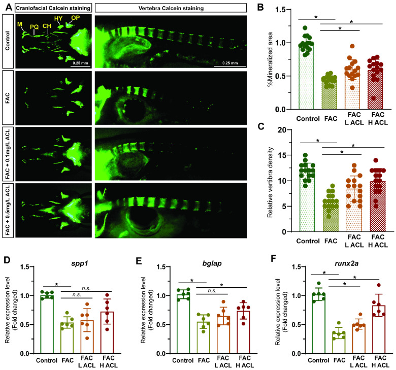 ACL attenuated the inhibition effect of FAC in bone formation in zebrafish. (A) Calcein staining of zebrafish larvae (7 dpf) cranium from control, FAC (200 µg/mL), FAC with low (0.1 mg/L) or high (0.5 mg/L) concentration ACL treatment groups. (B) Mineralized areas were quantified and shown in the graph. (C) The number of calcein-stained vertebra bodies were calculated. (D–F) The relative mRNA expression of spp1, bglap and runx2a in zebrafish larvae treated with blank medium, FAC, FAC + high (0.5 mg/L) or low (0.1 mg/L) ACL were determined by qPCR. The mean value of blank medium-only treated group was set to 1.0. Data are showed as mean ± standard error. * means p < 0.05 between two indicated groups (n = 6). M, Meckel; PQ, palatoquadrate; CH, ceratohy; HY, hyomandibula (hyosympletic); OP, opercula.