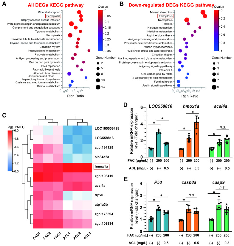 RNA-seq identified that ferroptosis may be involved in anti-osteoporosis effect of ACL under FAC exposure. (A) KEGG pathway enrichment analysis of all differentially expressed genes (DEGs) between ACL and ACL + FAC groups. (B) KEGG pathway enrichment analysis of down-regulated genes in ACL + FAC treated zebrafish larvae compared to ACL treated larvae. (C) Heatmap of 11 ferroptosis-related genes identified from DEGs. FAC represents the group treated with FAC alone, while ACL represents the group treated with both FAC and ACL. Each row represents one gene, and each column represents one sample. Red represents genes with high expression, blue represents genes with low expression. Darker colors indicate more significant differences. (D) Verification of mRNA expression level of ferroptosis-related genes in 5 dpf zebrafish larvae treated with 200 µg/mL FAC with or without 0.5 mg/L ACL. (E) Quantitative analysis of mRNA expression levels of three apoptosis genes, P53, casp3a and casp9. * means p < 0.05 between two indicated groups (n = 6). Data are displayed as mean ± SD.