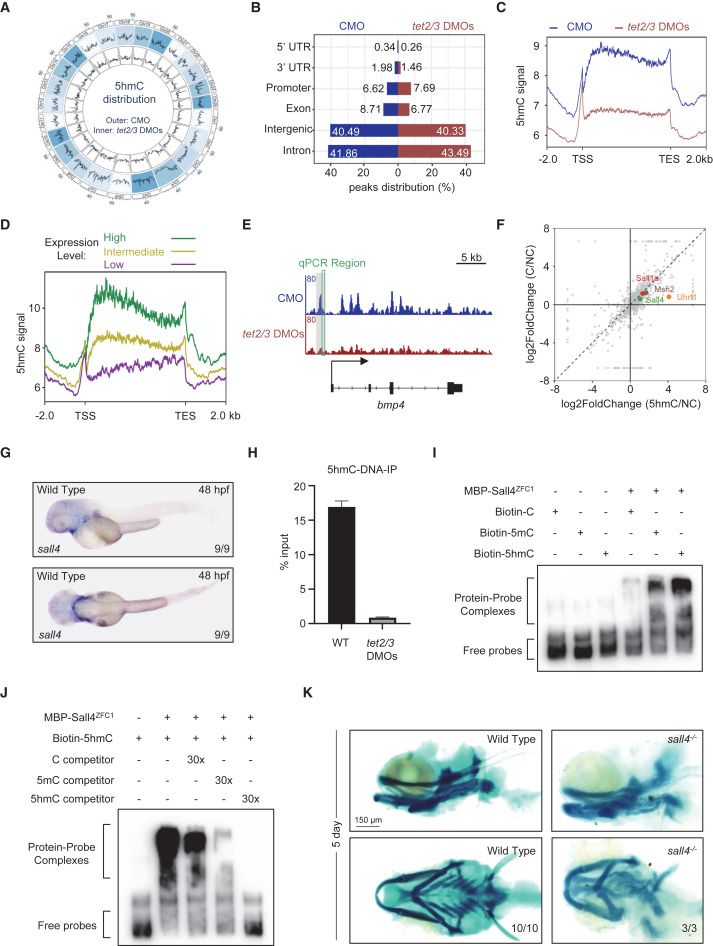 Fig. 5 Sall4 recognizes 5hmC and controls the Bmp4 expression to regulate pharyngeal cartilage development (A) Circos plot showing 5hmC distribution pattern across whole genome in embryos injected with indicated morpholinos at 48 hpf. Outer circle, CMO samples. Inner circle, tet2/3 DMOs samples. (B) Histogram showing the 5hmC distribution in different genomic regions in embryos injected with CMO (blue) and tet2/3 DMOs (red) at 48 hpf. (C) The density of 5hmC signals in genes. The 2-kb upstream and downstream flanks are aligned. 5hmC enrichments within each 10-bp interval are plotted. TSS, transcription start site; TTS, transcription termination site. (D) 5hmC over genes with different expression levels. High expression (green): fragments per kilobase of exon per million mapped fragments (FPKM) ≥10. Intermediate expression (yellow): 1 ≤ FPKM < 10. Low expression (purple): FPKM < 1. (E) Integrative genomics viewer (IGV) visualization of 5hmC peaks surrounding bmp4 in embryos CMO (blue) and DMO (red). The green box indicates the position selected for qPCR analysis. (F) Scatterplot showing proteins enriched by C or 5hmC-contained probes. (G) In situ hybridization assay showing sall4 transcripts in wild-type embryos at 48 hpf. Upper, lateral views, anterior toward the left. Lower, dorsal views, anterior toward the left. (H) qPCR analysis showing a significant reduction of 5hmC modification on the bmp4 promoter. Error bars represent +SD for three replicates. (I) EMSA showing the signals of the shifted probe bands in the presence of Sall4ZFC1 protein. (J) Competitive EMSA in different titrations showing the different affinities of Sall4ZFC1 protein to C/5mC/5hmC double-stranded DNA probes. (K) Alcian blue staining showing defective cartilage phenotypes in sall4 mutant embryos at 5 dpf. Upper, lateral views, anterior toward the left. Lower, ventral views, anterior toward the left. Scale bars, as indicated. See also Figure S7.