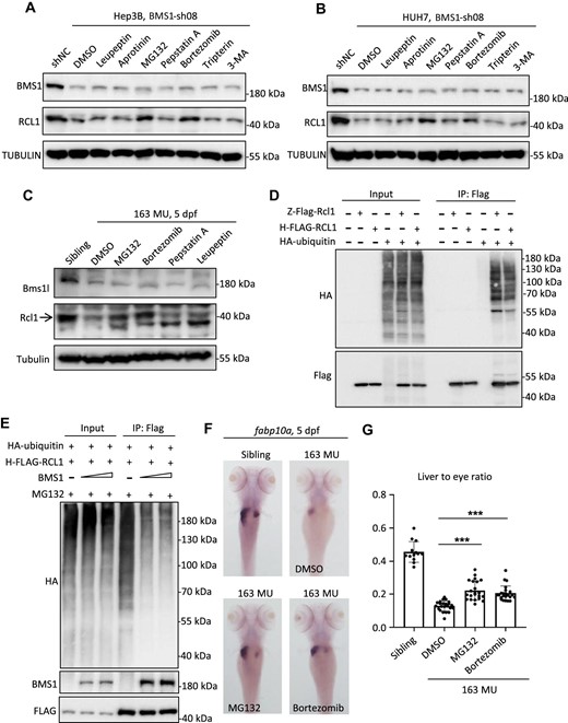 Fig. 4 RCL1 is degraded through the ubiquitination–proteasome pathway. (A and B) After BMS1 knockdown by sh08, Hep3B (A) or HUH7 (B) cells were treated with leupeptin, aprotinin, MG132, pepstatin A, bortezomib, tripterin, or 3-MA, followed by western blot analysis to examine protein levels of BMS1 and RCL1. DMSO: negative control. (C) bms1lsq163/sq163 mutant zebrafish were treated with MG132, bortezomib, pepstatin A, or leupeptin from 2 dpf to 5 dpf, followed by western blot analysis to examine protein levels of Bms1l and Rcl1 at 5 dpf. (D) Co-IP analysis of interactions between HA-ubiquitin and zebrafish Flag-Rcl1 (Z-Flag-Rcl1) or human FLAG-RCL1 (H-FLAG-RCL1). (E) Co-IP analysis of interactions among HA-ubiquitin, H-FLAG-RCL1, and BMS1. The transfected 293T cells were treated with MG132 for 24 h before cell harvest. (F and G) WISH analysis using liver-specific fabp10a probe in bms1lsq163/sq163 mutant and siblings after MG132 or bortezomib treatment at 5 dpf. The area ratio of liver to eye was calculated. ***P < 0.001.
