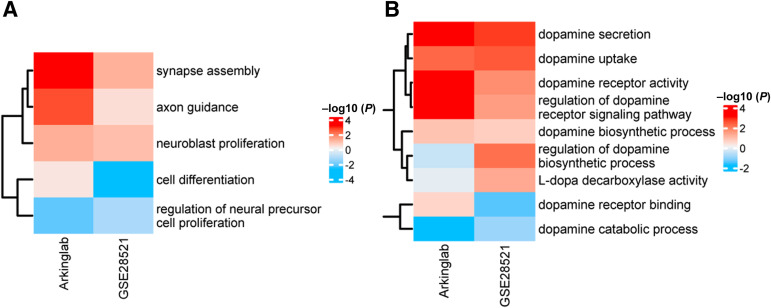 Fig. 1 A and B: Expression changes in development-related gene sets (A) and dopaminergic gene sets (B) in the GSE28521 data set (https://www.ncbi.nlm.nih.gov/geo) and the Arkinglab data set (http://www.arkinglab.org/resources). Red depicts up-regulation, and blue denotes down-regulation. Gene expression changes with P < 0.05 are shown.