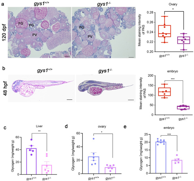 Fig. 3 Maternal loss of gys1 caused reduced of ovarian (F2) and embryonic (F3) glycogen reserve. (a) Representative photographes of PAS glycogen staining in ovaries of F2 gys1 WT and gys1 MT (left) in adults; Unpaired t-test statistical analysis of average PAS staining intensity in F2 g gys1 WT and gys1 MT ovarian glycogen staining (right, gys1WT n = 8, gys1MT n = 7, Scale bar = 200 μm *P < 0.05). PG: primary growth stage; PV: pre-vitellogenic stage; FG: full growth stage. (b) Representative photos of PAS glycogen staining in F3 gys1 WT and gys1 MT embryos at 48 hpf (left). Unpaired t-test statistical analysis of average staining intensity analysis of glycogen accumulation in embryos (right, gys1WT n = 5, gys1MT n = 5, Scale bar = 200 μm, ***p < 0.001). (c–e) Glycogen content (mg) per weight (g) analysis of liver (gys1WT n = 5, gys1MT n = 6, **p < 0.01), ovary (gys1WT n = 6, gys1MT n = 6, *p < 0.05) in 180 dpf adults and 24 hpf embryo (gys1WT n = 8, gys1MT n = 8, ***p < 0.001). Unpaired t-test was used as the statistical analysis.