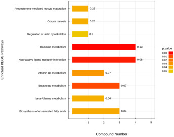 Fig. 6 Enriched KEGG pathway analysis revealed by Untargeted metabolomics. KEGG pathway analyzed with MetaboAnalyst 5.0 for the different expressed metabolic profiles between gys1 WT and MT at 24 hpf. p value was determined by Fisher's Exact Test and indicated on the right. Compound number represents to the number of differentially expressed metabolites contained in each KEGG metabolic pathway.