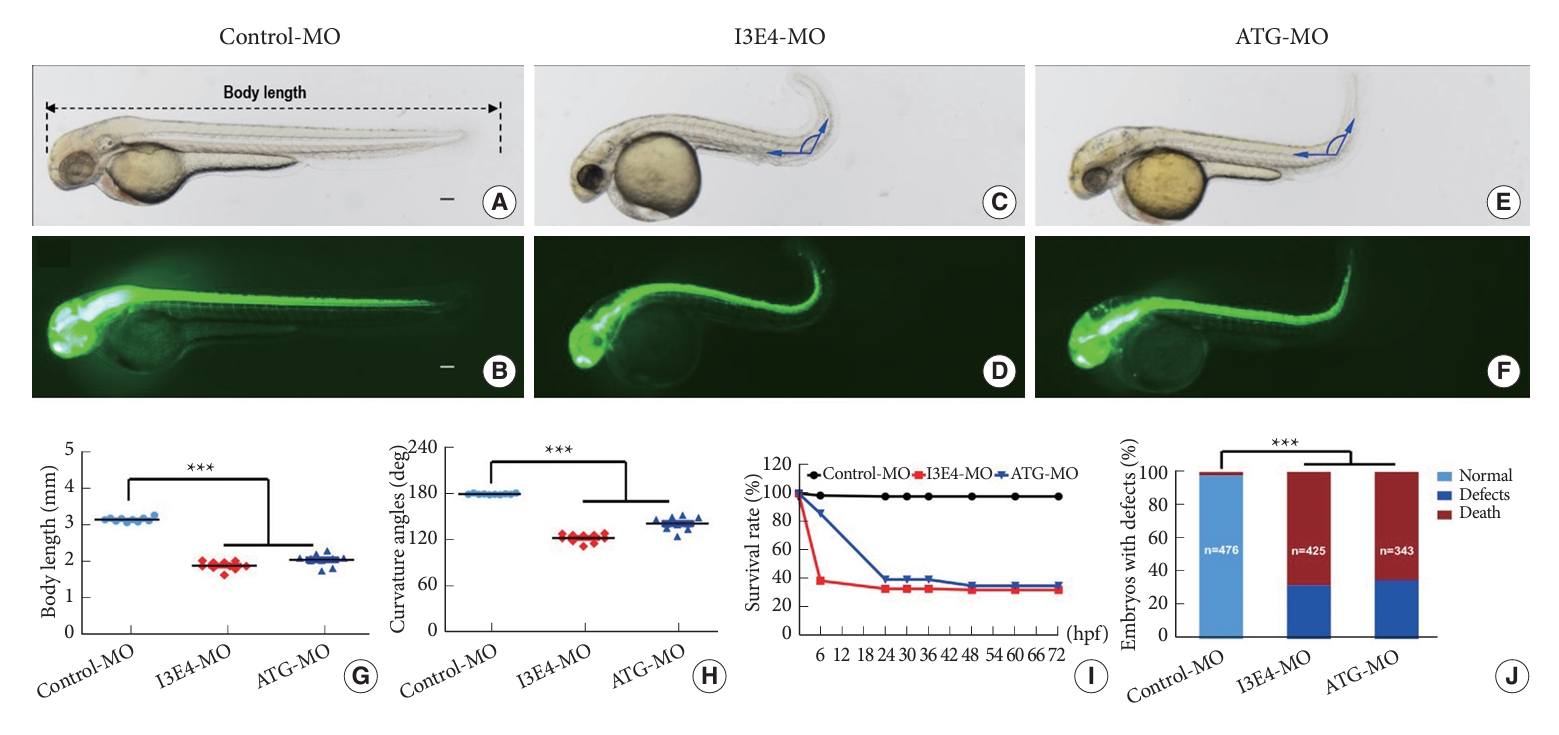 Fig. 1 Body length, body axis and survival rate of best1 zebrafish morphants. (A–F) Gross morphology of transgenic (HuC:EGFP) zebrafish embryos at 2-dpf. Compared with control morpholino (MO), knock down best1 causes shorter body length (C–F), curved body axis (C–F). (G) A time-course plot of percent survival in control versus best1 morphants for 3 days. (H) The percentage of embryos with development defects. (I, J) Quantification of body length (I) and curvature angles (J) of embryos. Columns, mean; standard error of the mean (n = 10; analysis of variance), ***p < 0.0001. Scale bar, 100 μm. dpf, days post fertilization.