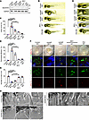 Fig. 2 Zebrafish ndufaf2 morpholino–injected mutants exhibit a ciliopathy phenotype. (A) Protein levels of control morpholino (MO)–injected, ndufaf2 morpholino–injected, and p53 morpholino–injected embryos and ndufaf2 morpholino–injected embryos re-expressing NDUFAF2WT. Western blot analysis was performed with antibodies against NDUFAF2 and GAPDH. (B) Transmitted light images of body shape in control MO–, ndufaf2 morpholino–, and p53 morpholino–injected zebrafish larvae and ndufaf2 morpholino–injected zebrafish larvae re-expressing NDUFAF2WT, at 5 days post-fertilization (dpf). (C) Quantification of body curve in control MO–, ndufaf2 morpholino–, and p53 morpholino–injected zebrafish larvae and ndufaf2 morpholino–injected zebrafish larvae re-expressing NDUFAF2WT, at 5 dpf; >30 larvae analyzed for each independent experiment. (D) Transmitted light images of heart in control MO–, ndufaf2 morpholino–, and p53 morpholino–injected zebrafish larvae and ndufaf2 morpholino–injected zebrafish larvae re-expressing NDUFAF2WT, at 5 dpf. Arrows indicate the heart. (E) Quantification of heart failure in control MO–, ndufaf2 morpholino–, and p53 morpholino–injected zebrafish larvae and ndufaf2 morpholino–injected zebrafish larvae re-expressing NDUFAF2WT, at 5 dpf; >30 larvae analyzed for each independent experiment. (F) Confocal images of Kupffer’s vesicle (KV) cells labeled with cilia markers, Arl13b (green) and pGlu-Tu (red), in control MO–, ndufaf2 morpholino–, and p53 morpholino–injected zebrafish larvae and ndufaf2 morpholino–injected zebrafish larvae re-expressing NDUFAF2WT, at 8 somite stage. Scale bar: 20 μm. (G) Quantification of KV cilia number in control MO–, ndufaf2 morpholino–, and p53 morpholino–injected zebrafish larvae and ndufaf2 morpholino–injected zebrafish larvae re-expressing NDUFAF2WT; >30 larvae analyzed for each independent experiment. (H) TEM images of ndufaf2-mutant zebrafish showing shortened and disorganized photoreceptor outer segments at 5 dpf. Representative images of control MO– and ndufaf2 morpholino–injected zebrafish larvae and ndufaf2 morpholino–injected zebrafish larvae re-expressing NDUFAF2WT, at 5 dpf. Boxes show areas of enlarged mitochondria. M, mitochondria; M*, swollen mitochondria; OS*, shorter outer segment of photoreceptor. Scale bars: 2 μm. The bars in each graph represent mean ± SD. Exact P values are indicated. ANOVA followed by Tukey-Kramer multiple-comparison test.