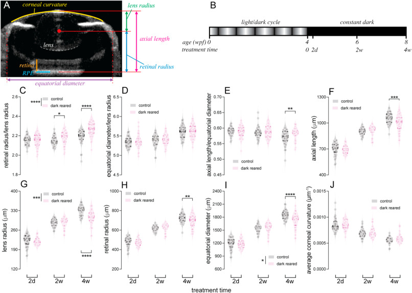 Fig. 1 Comparison of ocular biometric parameters between control and dark-reared zebrafish. (A) Using optical coherence tomography (OCT) images of zebrafish eyes, ocular parameters including axial length, lens radius, retinal radius, equatorial diameter and corneal curvature were quantified. Lens (white dashed lines), retina (orange solid line) and retinal pigmented epithelium (RPE; light blue solid line) are highlighted in the representative image. (B) For dark-rearing, zebrafish were reared under a normal light/dark cycle until 4 weeks post-fertilization (wpf), followed by 2 days (2d), 2 weeks (2w) or 4 weeks (4w) of exposure to a constant dark environment. Controls were age-matched fish reared under normal lighting. (C–J) To analyze the impact of dark rearing, ratios of (C) retinal radius to lens radius, (D) equatorial diameter to lens radius, and (E) axial length to equatorial diameter, as well as (F) axial length, (G) lens radius, (H) retinal radius, (I) equatorial diameter and (J) averaged corneal curvature were compared between groups for each dark-rearing duration. In violin plots, dots show data for each individual retina. Thick bars indicate the median, and thin lines indicate interquartile ranges. N = 36, 40 and 40 fish per group for 2d, 2w and 4w of dark rearing, respectively. Two-way ANOVA was performed. *P < 0.05; **P < 0.01; ***P < 0.001; ****P < 0.0001. Asterisks next to the vertical bars indicate the group effect, those above or below the horizontal bracket indicate Fisher's LSD post-hoc comparisons. Given that differences between groups for the tested parameters, if any, were in relatively small ranges, for better visualization, y-axes of figures may not start from 0. (For interpretation of the references to color in this figure legend, the reader is referred to the Web version of this article.)
