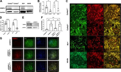 Fig. 1 Decreased OSBPL7 expression in mouse models of experimental CKD is associated with podocyte injury. A and B: representative Western blot images (A) and quantification showing OSBPL7 levels in the kidney cortex of Col4a3−/− and db/db mice compared with Col4a3+/+ (n = 3, *P < 0.05) and db/+ (n = 4, **P < 0.001) littermates (B). C: immunofluorescence staining showcasing OSBPL7 (green) and WT1 (red) in glomeruli, with the merged image highlighting their colocalization, indicating OSBPL7's association with podocytes. D: quantification of OSBPL7 and WT1 colocalization, presented as the ratio of OSBPL7/WT1 double-positive signals to total WT1-positive cells, showing the significant decrease in OSBPL7 in the glomeruli of CKD models compared with controls (n = 10, ****P < 0.0001). E: stable OSBPL7-deficient (SiOSBPL7) podocytes were generated using siRNA. F: apoptosis levels increased in OSBPL7-deficient podocytes and returned to control levels with transfection of full-length OSBPL7 (OSBPL7FL) but not with transfection of OSBPL7 plasmid containing a deletion of the FFAT domain (OSBPL7FFAT−). n = 3 technical replicates. *P < 0.05 and **P < 0.01. G: immunofluorescent images of OSBPL7 (red), ER stain (green), and DAPI (blue) in siOSBPL7 cells with and without OSBPL7FL or OSBPL7FFAT− expressing plasmid. CKD, chronic kidney disease; OSBPL7, oxysterol-binding protein-like 7.