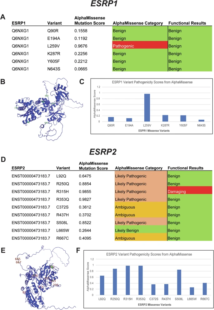 Fig. 4 AlphaMissense pathogenicity predictions for ESRP1 and ESRP2 missense variants.ESRP1 and ESRP2 gene variants from OFC cases in the GMFK Children’s dataset and ClinVar variants associated with cleft lip and/or palate or autosomal recessive deafness were identified. Six ESRP1 and nine ESRP2 (A), (D) missense variants were analyzed using the AlphaMissense (AM) model. The tables (C), (F) show the AM-predicted pathogenicity compared to our functional test results and the AM mutation score, which is also graphed. On the left, the ESRP1 and ESRP2 AlphaFold structures (B), (E), with labeled missense mutations, color-coded with the functional results.