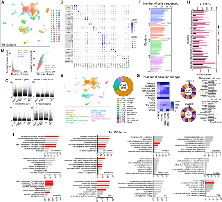 Fig. 2 Single-cell transcriptomics in abca7 knockout zebrafish (A) Combined UMAP plot for single-cell transcriptomics from wild-type + PBS, wild-type + Aβ42, abca7+/− + PBS, and abca7+/− + Aβ42 samples; 36 cell clusters were identified. (B) Percentage of mitochondrial counts and number of genes per cell. (C) Number of genes, number of reads per cell, percentage of mitochondrial gene expression, and percentage of ribosomal genes in every sample. (D) Dotplot for cell-type markers identify distinct cell types. (E) UMAP plot classifying cell types and their percent prevalence in a total of 50,691 cells sequenced. (F) Distribution of the number of cells sequenced in all 36 clusters in every sample. (G) Heatmap showing the number of sequenced cells per cell type. (H) Number of differentially expressed genes (DEGs, black) and gene ontology (GO) terms related to biological processes (magenta) between wild-type + Aβ42 and abca7+/− + Aβ42 samples. Lower panels indicate pie chart of the percentage of GO terms and DEGs per cluster between wild-type + Aβ42 and abca7+/− + Aβ42 samples, and the numbers of GO terms and DEGs per cell type as bar graphs. (I) Tally for top GO terms in distinct cell types. Neuropeptide signaling pathway and neurogenesis are enriched in neurons, neuroblasts, astroglia, oligodendrocyte progenitors, and vascular smooth muscle cells. See also Figures S2–S4 , Data S2 and S3 , and Table S1 .