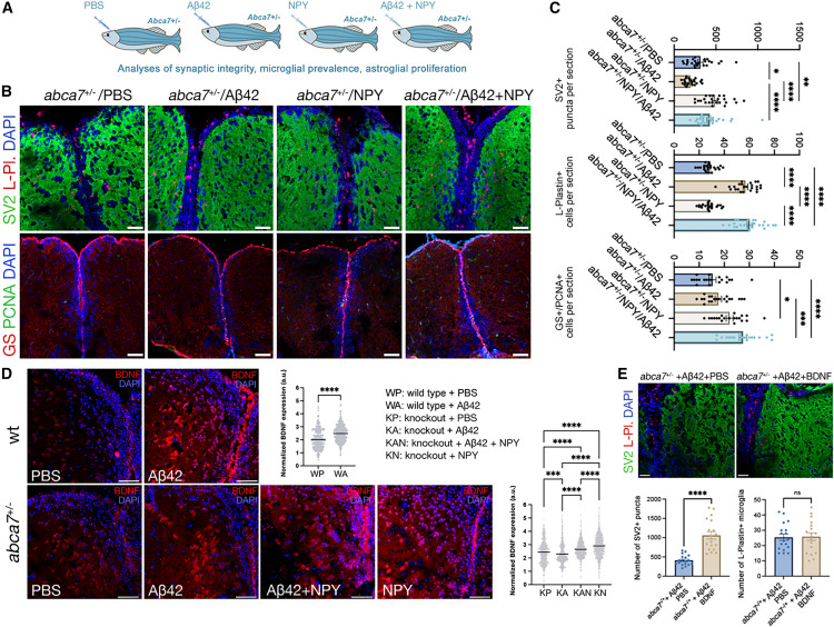 Fig. 6 ABCA7 regulates synaptic integrity and astroglial proliferation through BDNF (A) Experimental setup for investigating the biological relevance of NPY to abca7 function and amyloid-induced alterations in synaptic integrity, microglial activity, and astroglial proliferation. (B) Immunofluorescence for SV2 + L-plastin and GS + PCNA with DAPI counterstains in abca7+/− + PBS, abca7+/− + Aβ42, abca7+/− + NPY, and abca7+/− + Aβ42 + NPY brains. (C) Quantification for number of SV2-positive synaptic puncta, L-plastin-positive microglia, and GS/PCNA double-positive proliferating astroglia. n = 4 animals from both sexes and ≥20 brain sections per group. One-way ANOVA with Tukey’s multiple comparison test was used for statistical analyses. No comparison bar indicates no significance. (D) BDNF immunoreactivity in wild-type and abca7 knockout zebrafish with and without Aβ42. Aβ42 induced BDNF (red) in wild-type animals but not in abca7 knockout. Injection of NPY with or without Aβ42 restores the induced BDNF expression levels. Non-parametric Kolmogorov-Smirnov test comparing cumulative distributions and one-way ANOVA with Tukey’s multiple comparison test were used for statistical analyses. (E) Immunofluorescence for SV2 and L-plastin with DAPI counterstain in abca7+/− + Aβ42 + PBS and abca7+/− + Aβ42 + BDNF zebrafish brains. Quantification for the number of SV2-positive synaptic puncta and the number of L-plastin-positive microglia. Non-parametric Kolmogorov-Smirnov test comparing cumulative distributions was used for statistical analyses. BDNF rescues synaptic integrity changes in abca7+/− knockout similar to NPY. n = 4 animals from both sexes, with 18 brain sections per group. ∗p < 0.0332, ∗∗p < 0.0021, ∗∗∗p < 0.0002, ∗∗∗∗p < 0.0001; not significant (ns), p > 0.0332. Scale bars, 50 μm. See also Figures S1 and S4 , Data S1 and S3 , and Table S1 .