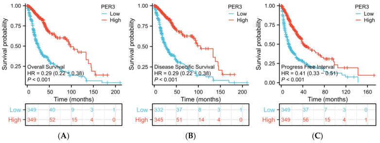 PER3 exhibits high prognostic predictive value in patients with GBM. k-M plots show the differences in (
