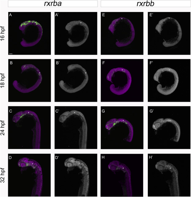 Fig. 9 Comparison of rxrba and rxrbb gene expression in and sox10:eGFP transgenic embryos. HCR shows the expression of rxraa (A, A′, B, B′, C, C′, D, D′) and rxrab (E, E′ F, F′, G, G′, H, H′) genes from 16 hpf to 32 hpf within sox10:GFP transgenic embryos. Both rxrba and rxrbb are highly expressed throughout the whole embryo. A, A′, E, E’: Lateral views at 16 hpf. B, B′, F, F’: Lateral views at 18 hpf. C, C′, G, G’: Lateral views of 24 hpf embryo head. D, D′, H, H’: Lateral views of 32 hpf embryo head. For all panels, green labels sox10:eGFP. For panels A–D′, magenta and grayscale images label rxrba expression. For panels E–H′ magenta and grayscale images label rxrbb expression Arrows indicate co-expression between sox10:eGFP and rxrb genes. The asterisks label the position of the otic vesicle. Scale Bar represents: 100um for images A-H’. The inserts magnify the co-expression between the neural crest and the genes shown.