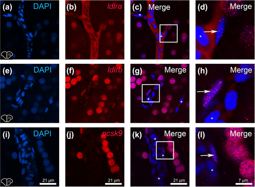 Fig. 6 ldlra, ldlrb and pcsk9 gene expression in endothelial cells. (a–l) Fluorescence in situ hybridization (red) for ldlra, ldlrb and pcsk9 (B, F and J) in the telencephalon of adult zebrafish with DAPI counterstaining (blue, a,e,i). (c,g,k,d,h,l) Merged images with high magnifications of the corresponding white squares. The arrows indicate the detection of transcripts in some cells exhibiting an elongated and flat nucleus localized along the blood vessels, corresponding to endothelial cells. Note that a weak expression is shown in endothelial cells for ldlra and pcsk9, whereas ldlrb appears qualitatively more expressed in these cells. Asterisks show DAPI nuclei without ISH staining. Bar: 21 μm (a,b,c,e,f,g,i,j,k) and 7 μm (d,h,l).