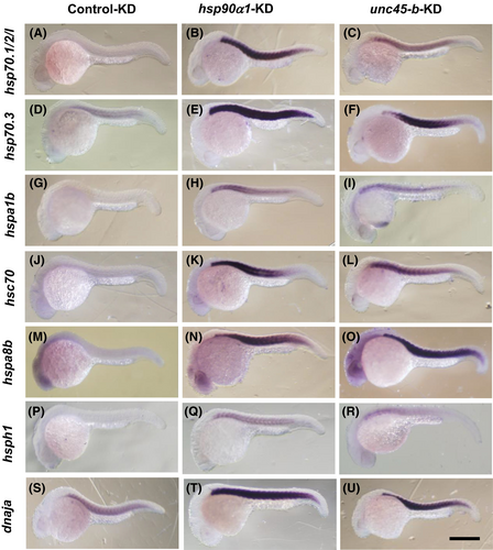 Fig. 3 The upregulation of heat shock protein gene expression is a shared stress response in fish embryos with muscle defects from hsp90α1 and unc45b knockdown. Hsp70 and cochaperone gene expression was analyzed in hsp90α1 and unc45b knockdown (KD) embryos by in situ hybridization at 24 hpf. Compared with the controls (A, D, G, J, M, P, and S), a muscle-specific upregulation of hsp70.1/2/l (B, C), hsp70.3 (E, F), hspa1b (H, I), hsc70 (K, L), hspa8b (N, O), hsph1 (Q, R), and dnaja (T, U) was detected in hspa90α1-KD (B, E, H, K, N, Q, T) and unc45-KD (C, F, I, L, O, R, U) zebrafish embryos at 24 hpf. All larvae are side view, with anterior left and dorsal up. Scale bar = 100 μm.