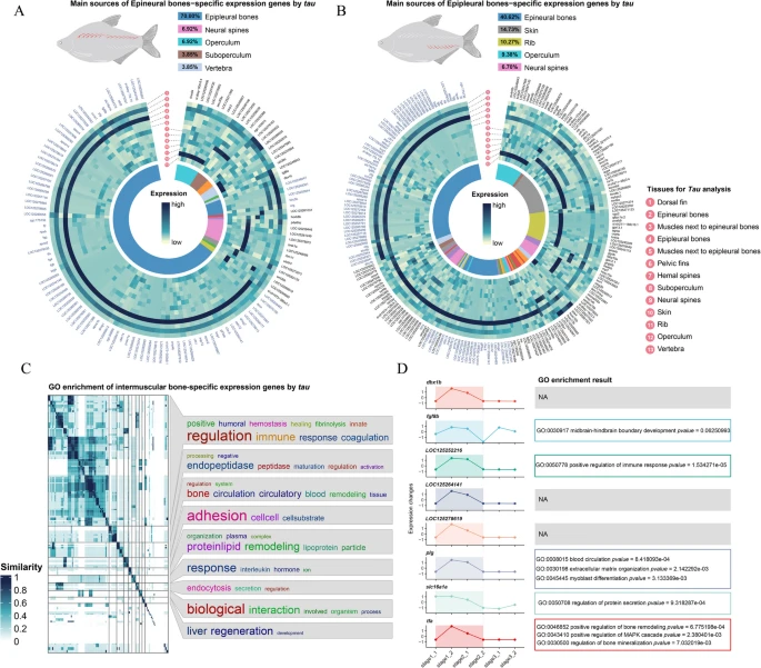 Fig. 2 Gene recruitment and cellular origin of ENB and EPB in blunt snout bream. A Genes recruited to ENBs mainly originated from epipleural bones (EPBs), neural spines, operculum, suboperculum, and vertebra. The expression levels of ENB-specific expression genes were depicted in heatmap. B Genes recruited to EPBs mainly originated from epineural bones (ENBs), skin, rib, operculum, and neural spines. The expression levels of EPB-specific expression genes were depicted in heatmap. C Gene Ontology (GO) analysis of the intersection of ENB-specific expression genes and EPB-specific expression genes. D Temporal expression and GO analysis of genes influenced by Ts3R