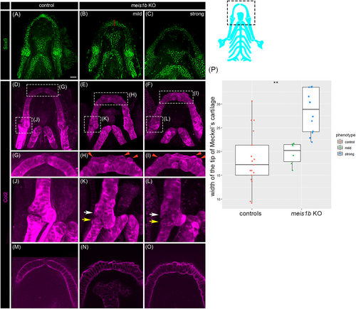Fig. 3 Chondrocytes of the Meckel's cartilage appear unaligned in meis1b KO mutants. (A–C) Whole-mount antibody staining of chondrocytes with Sox9 (green) and (D–O) Col2 (magenta) at 8 dpf. (A–I), (M–O), Ventral views; (J–L), lateral view; anterior to the top. The position of cartilage in images is displayed in a dotted frame in the scheme (right). (G–I) Magnification of dotted frame of (D–F), the border between Meckel's cartilages is missing in meis1b mutants (H, I). (H, I) Chondrocytes are misaligned which causes irregularities in the cartilage (red arrowheads). (J–L) Magnification of dotted frame of (D–F) from lateral view; The posterior end of the Meckel's cartilage (white arrows) and anterior end of palatoquadrate (red arrows) are deformed. The gap within the jaw joint is missing. (M–O) Optical section of the Meckel's cartilage from (D–F). (M) Chondrocytes are stacked in columns of columnar-shaped cells. (N, O) The shape of chondrocytes is uneven and chondrocytes are unorganized. The red line indicates the site of width measurement of Meckel's cartilage. (P) Quantification of the width of the tip of Meckel's cartilage. Two tailed t-test was used for statistical analysis, control (n = 17), mutants (n = 17: mild = 6, strong = 11), **p < .01. Scale bar = 30 μm.