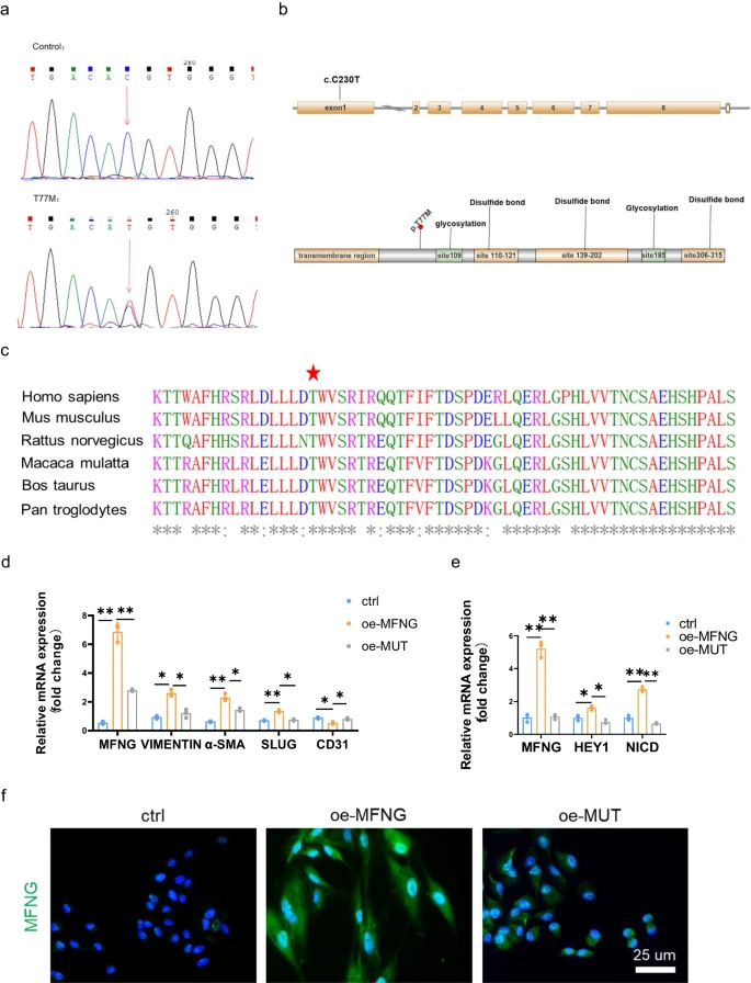 Fig. 7 Validation and in silico analysis of the MFNG variant. a Sequences showing the MFNG missense variant, identified in both patients and healthy controls, with arrows indicating heterozygous nucleotide changes. b Depiction of the MFNG gene’s exon and protein structure, highlighting the location of the genetic variation within this study. Exon 1 of MFNG harbored the base substitutions. The amino acids were primarily composed of glycosylation and disulfide bond domains. c The MFNG mutation was found to exhibit a high degree of conservation across vertebrates, as evidenced by the Clustal X alignment of the MFNG protein in various species. Stars indicate identical residues. In our study, human umbilical vein endothelial cells (HUVECs) served as the control group. HUVECs transfected with the MFNG wild-type plasmid were designated as the overexpression group (oe-MFNG), while HUVECs transfected with the MFNG mutant plasmid were designated as the mutant group (oe-MUT). d, e The relative mRNA expression of MFNG, genes associated with EndMT, and molecules related to the Notch pathway in HUVECs subjected to various treatments was meticulously assessed, employing GAPDH as a reference gene. Significantly distinct mRNA expression levels of MFNG, EndMT-related genes, and Notch pathway molecules were evident when comparing the oe-MFNG and oe-MUT groups. f Cellular immunofluorescence staining underscored the diminished expression of MFNG in the oe-MUT groups compared to the oe-MFNG groups, as visualized through microscopic images. Scale bars = 25 µm