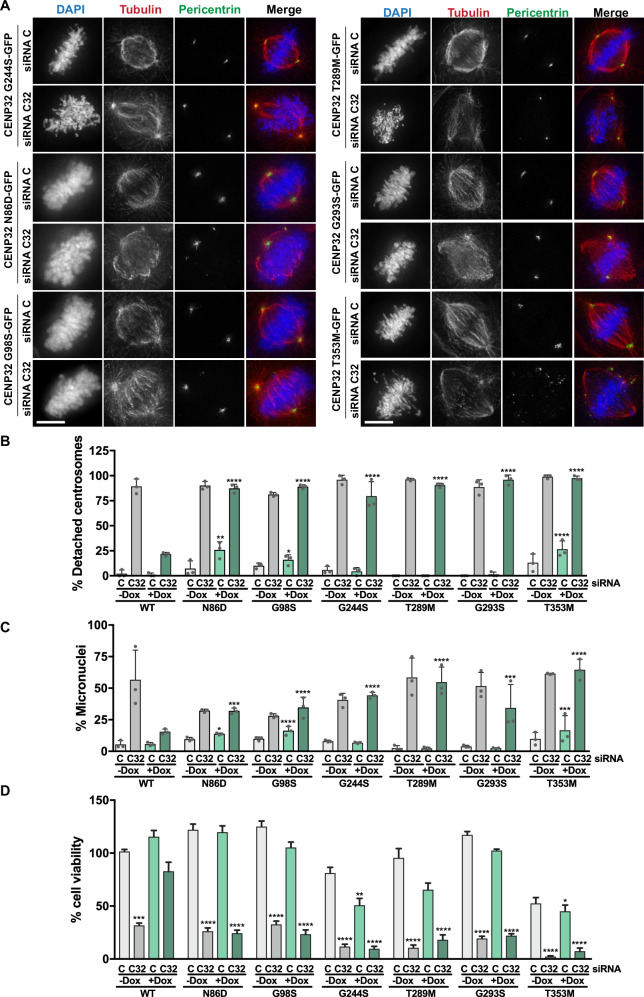 A Representative fluorescence images of a Control (siRNA C) or SPOUT1/CENP-32 (siRNA C32) siRNA rescue assay in stable U2OS cell lines with inducible expression of different SPOUT1/CENP-32-GFP constructs. Conditions with doxycycline only; conditions without doxycycline in Fig. S17A. B, C Quantification for the analysis of the centrosome detachment phenotype (% of cells with detached centrosomes; B) and chromosome segregation errors (% of micronuclei; C) in inducible U2OS cell lines expressing SPOUT1/CENP-32 WT-GFP or the SPOUT1/CENP-32 patient variants. For easy direct comparison with the SPOUT1/CENP-32 variant conditions, the SPOUT1/CENP-32 WT conditions shown in Fig. 6D are also shown in this figure. Data are representative of a minimum of three biological replicates, n ≥ 70 cells analyzed in total per treatment, mean ± SD, n = 3. Scale bar, 10 μm. Two-sided Fisher’s exact test with Bonferroni correction (*, P ≤ 0.05; **, P ≤ 0.01; ***, P ≤ 0.001; ****, P ≤ 0.0001). Exact p-values for the detachment centrosome phenotype (B) vs WT condition are: N86D siRNA C +Dox=3.1E-03, N86D siRNA C32 +Dox=4.3E-30, G98S siRNA C +Dox=1.9E-02, G98S siRNA C32 +Dox=4.9E-33, G244S siRNA C32 +Dox=4.8E-15, T289M siRNA C32 +Dox=1.8E-25, G293S siRNA C32 +Dox=2.7E-30, T353M siRNA C +Dox=3.3E-07, T353M siRNA C32 +Dox=4.1E-28. Exact p-values for the micronuclei phenotype (C) vs WT condition are: N86D siRNA C +Dox=1.3E-02, N86D siRNA C32 +Dox=2.9E-04, G98S siRNA C32 -Dox=1.9E-07, G98S siRNA C +Dox=2.5E-04, G98S siRNA C32 +Dox=2.1E-05, G244S siRNA C32 +Dox=1.6E-15, T289M siRNA C32 +Dox=1.2E-24, G293S siRNA C32 +Dox=1.3E-03, T353M siRNA C +Dox=1.1E-04, T353M siRNA C32 +Dox=5.5E-37. Data points for each of the replicates are shown. Source data are provided as a Source Data file. D Cell viability evaluation of inducible U2OS cell lines expressing SPOUT1/CENP-32 WT-GFP or SPOUT1/CENP-32 patient variants assessed by the MTT assay. For easy direct comparison with the SPOUT1/CENP-32 variant conditions, the SPOUT1/CENP-32 WT conditions shown in Fig. 6E are also shown in this figure. Three independent biological replicates, mean ± SEM. WT siRNA C -Dox: n = 26; WT siRNA C32 -Dox; n = 26; WT siRNA C +Dox: n = 25; WT siRNA C32 +Dox: n = 27; N86D siRNA C -Dox: n = 22; N86D siRNA C32 -Dox: n = 25; N86D siRNA C +Dox: n = 27; N86D siRNA C32 +Dox: n = 22; G98S siRNA C -Dox: n = 27; G98S siRNA C32 -Dox; n = 26; G98S siRNA C +Dox: n = 27; G98S siRNA C32 +Dox: n = 24; G244S siRNA C -Dox: n = 25; G244S siRNA C32 -Dox; n = 27; G244S siRNA C +Dox: n = 27; G244S siRNA C32 +Dox: n = 27; T289M siRNA C -Dox: n = 18; T289M siRNA C32 -Dox; n = 18; T289M siRNA C +Dox: n = 18; T289M siRNA C32 +Dox: n = 18; T353M siRNA C -Dox: n = 18; T353M siRNA C32 -Dox; n = 18; T353M siRNA C +Dox: n = 18; T353M siRNA C32 +Dox: n = 18; G293S siRNA C -Dox: n = 27; G293S siRNA C32 -Dox; n = 27; G293S siRNA C +Dox: n = 27; G293S siRNA C32 +Dox: n = 27. Non-parametric ANOVA with Kruskal-Wallis followed by Dunn’s multiple comparisons test (*, p ≤ 0.05; **, p ≤ 0.01; ***, p ≤ 0.001; ****, p ≤ 0.0001). Exact p-values vs WT siRNA C -Dox condition are: WT siRNA C32 -Dox=1.4E-04, N86D siRNA C32 -Dox=2.4E-06, N86D siRNA C32 +Dox=4.6E-06, G98S siRNA C32 -Dox=8.7E-05, G98S siRNA C32 +Dox=2E-07, G244S siRNA C32 -Dox=1E-07, G244S siRNA C +Dox= 6.8E-03, G244S siRNA C32 +Dox=1E-07, T289M siRNA C32 -Dox=1E-07, T289M siRNA C32 +Dox= 1E-07, G293S siRNA C32 -Dox=1E-07, G293S siRNA C32 +Dox=1E-07, T353M siRNA C32 -Dox= 1E-07, T353M siRNA C +Dox=1.4E-02, T353M siRNA C32 +Dox=1E-07. Source data are provided as a Source Data file.