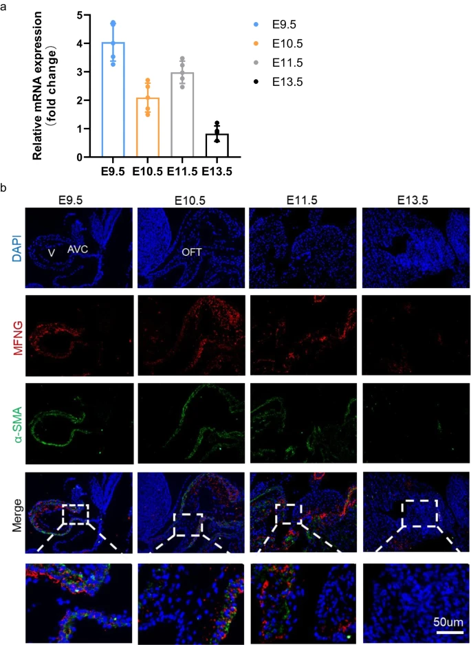 Fig. 1 Expression of MFNG in mice during embryonic heart development. a qRT-PCR analysis of MFNG mRNA levels during the embryonic heart development of mice. GAPDH served as an internal reference. b Immunofluorescence staining revealed the endogenous distribution of MFNG at E9.5–E11.5 and E13.5 in mouse embryos. Scale bars = 50 µm. All data presented here were obtained from five independently repeated biological experiments