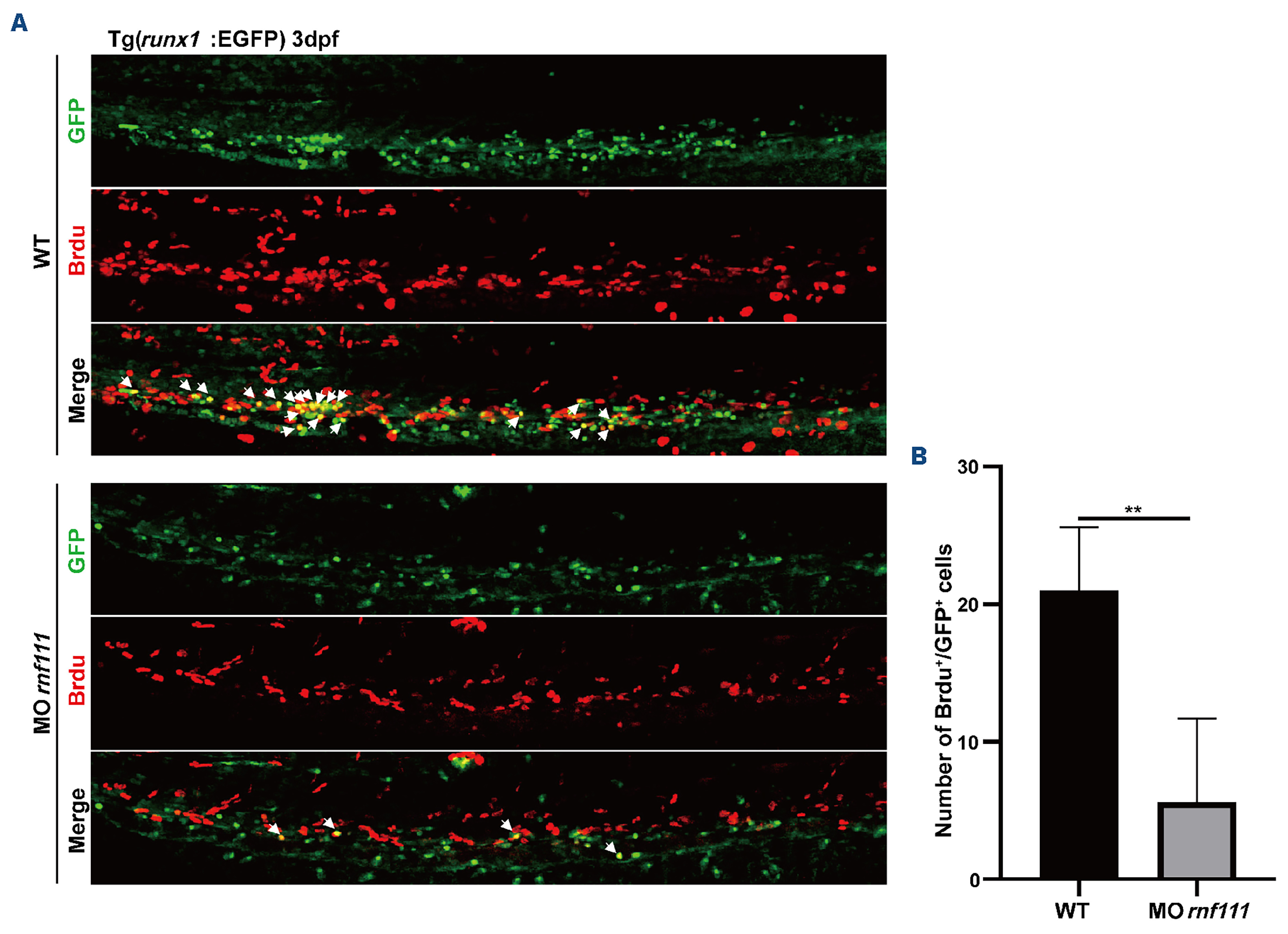 Fig. 4 Bromodeoxyuridine incorporation assay. (A) Double immunostaining of runx1-EGFP with green fluorescent protein (GFP) and anti-bromodeoxyuridine (Brdu) in the caudal hematopoietic tissue of the transgenic Tg (runx1-EGFP) line at 3 dpf. White arrows indicate Brdu and runx1-EGFP double-positive cells. (B) Statistics of Brdu and runx1-GFP double-positive cells. The data are presented as mean ± standard deviation. with **P<0.01. dpf: days post-fertilization; WT: wild-type; MO rnf111: rnf111 morphants.