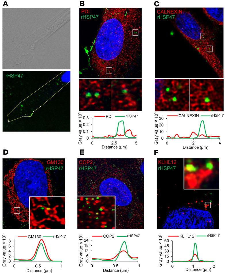 (A) The intracellular uptake and presence of rHSP47-GFP is shown by bright-field and immunofluorescence (n = 3, representative image is shown). (B and C) Representative immunofluorescence images of primary wild-type fibroblasts incubated with rHSP47-GFP and stained for the ER markers protein disulfide isomerase (PDI) and calnexin (n = 3), (D) with the cis-Golgi marker Golgi matrix protein 130 (GM130), and with markers of the secretory vesicles (n = 3) (E) coat protein complex 2 (COP2) (n = 3) and (F) kelch-like family member 12 (KLHL12) (n = 3). Colocalization of rHSP47-GFP with cis-Golgi and secretory vesicles, but not with ER, is indicated by the overlapping peaks in the graphs. Nuclei were counterstained with DAPI. Original magnification, ×63 (insets further magnified ×4.5).