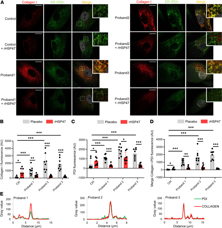 (A–D) Representative images (A) and quantification of immunofluorescence of (B) collagen I (aligned rank ANOVA [ARA] test, FARA = 18.06, P < 0.001 by overall test), (C) ER marker protein disulfide isomerase (PDI) (ARA test, FARA = 15.12, P < 0.001 by overall test), and of (D) collagen I–PDI signal (ARA test, FARA = 40.35, P < 0.001 by overall test) of osteogenesis imperfecta (OI) proband and control fibroblasts treated for 16 hours with 0.5 μM rHSP47 or with placebo. Asterisks in B–D indicate the post hoc test results. Biological replicates (n = 3) were performed. For each biological replicate, the signal was quantified on 8 images (original magnification, ×40) for each genotype/condition (number of cells, >90). Error bars indicate SD. (E) The colocalization of collagen I–PDI signal in proband 1, 2, and 3 cells is evident by the 2 overlapping peaks in the graph (n = 3). Nuclei were counterstained with DAPI. Scale bars: 15 μm. Zoomed inset magnification, ×3. Statistical analyses details are reported in Supplemental Table 2. *P < 0.05; **P ≤ 0.01; ***P ≤ 0.001.
