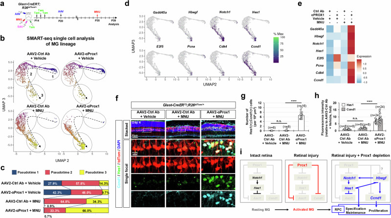 a Retinas from Glast-CreERT;R26tdTom/+ mice infected with AAV2-Ctrl Ab or AAV2-αProx1 were injured using MNU. MG lineage cells were then purified by FACS at the indicated time points for SMART-seq analysis (ae) or analyzed by immunostaining for RPC markers (fh). b UMAP plots from Monocle 3 analysis of SMART-seq data for FACS-purified tdTom-positive cells in vehicle- or MNU-treated Glast-CreERT;R26tdTom/+ mouse retinas (details in Methods). Dotted arrows indicate pseudotime progression, with circled areas marking distinct populations by pseudotime intervals. c Pseudotime distributions of cell populations for each sample are shown. d Pseudotime distributions of cells expressing RPC and proliferative cell marker mRNAs are plotted. e Heatmap displaying the mean expression levels of the indicated mRNAs in each sample. f Distribution of Ccnd1 and Hes1 in AAV2-infected Glast-CreERT;R26tdTom/+ mouse retinas was assessed by immunostaining. Magnified views of boxed areas in the top row are shown in the subsequent rows. g, h Graphs show the number of Ccnd1 and Hes1 double-positive cells (g) and the relative intensity of Ccnd1 and Hes1 in these cells (h). Error bars denote SEM. ****, p < 0.001; n.s., > 0.05 (one-sided Student’s t-test). i A hypothetical model illustrating the negative regulation of injury-induced MG reprogramming into RPCs by Prox1.