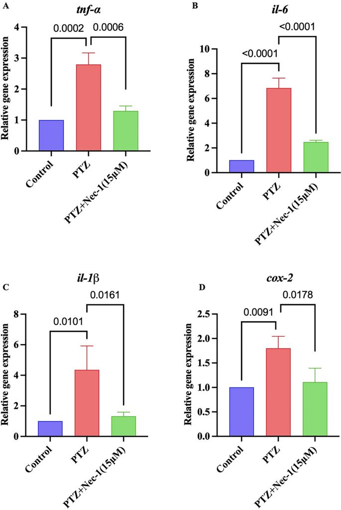 Fig. 5 Effect of selective RIPK1 inhibitor (Nec-1) on A TNF-α, B IL-6, C IL-1β, and D COX-2 expression in PTZ-induced epileptic zebrafish larvae (n = 50). The figure illustrates the inhibitory effect of Nec-1 on TNF-α, IL-6, IL-1β, and COX-2 gene expression in zebrafish exposed to PTZ. Results are expressed as mean ± SD, each performed in triplicate. Data were analyzed by one-way ANOVA, followed by Tukey’s post hoc test