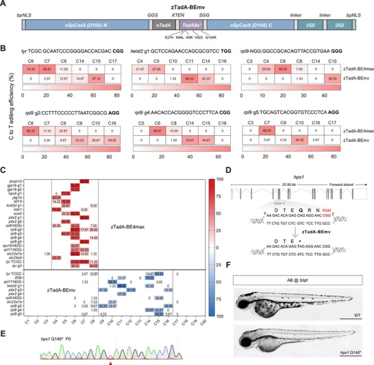 Complementary cytosine editing mediated by zTadA‐BEmv and zTadA‐BEmax. A) Schematic of the mRNA construct for zTadA‐BEmv. B) Comparison of the targeting window between zTadA‐BEmv (bottom) and zTadA‐BE4max (top) targeting six different loci with NGG PAM. C) Comparison of targeting window and editing efficiency between zTadA‐BEmax targeting twenty‐two NGG PAM sites across fifteen genes and zTadA‐BEmv targeting eleven NGG PAM sites across seven genes. The editing window of each tool is outlined by two dashed lines, and the average editing efficiency value for each cytosine locus is shown. D) Schematic diagram of the