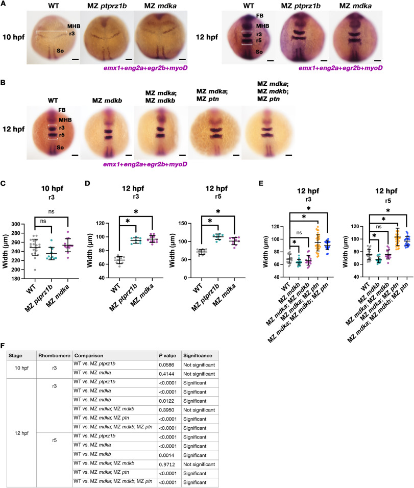 Fig. 4 MZ ptprz1b and MZ mdka mutants exhibit delayed neural keel convergence. (A-B) Whole-mount in situ RNA hybridization of WT, MZ ptprz1b and MZ mdka embryos at 10 and 12 hpf, and MZ mdkb, MZ mdka; MZ mdkb, MZ mdka; MZ ptn and MZ mdka; MZ mdkb; MZ ptn mutant embryos at 12 hpf. The maximum width of forming r3 and r5 is measured (white bar) using egr2b as a marker. Forebrain, mid-hindbrain boundary and somites are labelled by emx1, eng2a and myoD as landmarks, respectively. (C-F) Quantification of maximum width of r3 at 10 hpf (C) and r3 and r5 at 12 hpf (D-E). Data are presented as scattered dots. Mean ± SD of each dataset is indicated by line and error bar. Statistical comparison was performed between WT (N = 19, 10 hpf; N = 10, 12 hpf) and MZ ptprz1b (N = 10, 10 hpf; N = 8, 12 hpf) or MZ mdka (N = 13, 10 hpf; N = 10, 12 hpf) and between WT (N = 20, 12 hpf) and MZ mdkb (N = 15, 12 hpf), or MZ mdka; MZ mdkb (N = 15, 12 hpf) or MZ mdka; MZ ptn (N = 30, 12 hpf) or MZ mdka; MZ mdkb; MZ ptn (N = 20, 12 hpf) on Estimation Stats (https://www.estimationstats.com). P values calculated by two-sided permutation t-tests under a CI of 95% are shown in (F). Asterisks indicate statistical significance (P < 0.05).