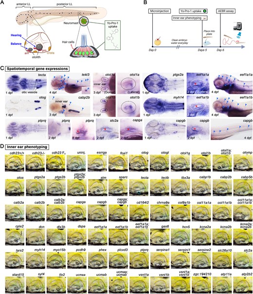 Fig. 9 Screening for genes involved in hearing and vestibular function by F0 approach. (A) The cartoon figure illustrates zebrafish larval sensory systems, including the inner ear and the neuromast in the lateral line. The inner ear contains the anterior macula (am) with an otolith attached to the ciliary bundles of macular hair cells, responsible for balance, and the posterior macula (pm) with an otolith attached to the ciliary bundles of macular hair cells, responsible for hearing. Additionally, there are three cristae for sensing angular rotation. Functional (mechanotransduction) and viable hair cells in the lateral line neuromast can uptake live nuclear dyes such as Yo-Pro-1. (B) A hearing gene screening pipeline was established. Embryos, both with and without microinjection, were rinsed with embryo water daily until 5 dpf for inner ear phenotyping and Yo-Pro-1 uptake experiments. The remaining larvae were individually transferred to 96-well plates for the AEBR assay at 6 dpf. (C) The WISH method was performed to study mRNA expression patterns for hearing genes. The blue arrowheads indicate the lateral line neuromast, the dashed close circle indicates the inner ear, and the red asterisk indicates the sensory epithelium in the inner ear. Stained embryos at 1 dpf for all genes, at 3 dpf for otol1a and otol1b in the left panel, and at 2 dpf for ptprq were displayed in dorsal view. The rest were shown in lateral view, with the anterior to the left. (D) Representative images of inner ear morphology for each F0 knockout. Scale bar = 0.1 mm. Lateral view with the anterior to the left.