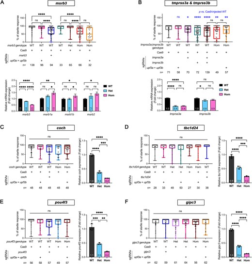 Fig. 11 Investigation of genetic compensation by inactivating upf3 paralogs in stable knockouts of hearing genes. (A) The msrb3 F0 knockouts exhibited a reduced AEBR compared to either Cas9-injected or upf3a;upf3b F0 knockout larvae. Similarly, msrb3 homozygous (Hom) knockouts showed a reduced AEBR compared to either WT or heterozygous (Het) larvae. RT-qPCR showed a significant reduction in tmprss3a, whereas tmprss3b was slightly reduced in both tmprss3a;tmprss3b heterozygous and homozygous knockouts. (B) The tmprss3a F0, tmprss3b F0, tmprss3a;tmprss3b F0, tmprss3aHom;tmprss3bHom and tmprss3aHom;tmprss3bHom coinjected with upf3a and upf3b gRNAs (tmprss3aHom;tmprss3bHom;upf3a;upf3b F0) showed a reduced AEBR compared to Cas9-injected larvae. Furthermore, tmprss3a;tmprss3b F0, tmprss3aHom;tmprss3bHom, and tmprss3aHom;tmprss3bHom;upf3a;upf3b F0 larvae exhibited a similar degree of reduction in AEBR assay. RT-qPCR showed a significant reduction in tmprss3a, whereas tmprss3b was slightly reduced in both tmprss3a;tmprss3b heterozygous and homozygous knockouts. (C-F) Comparisons of the AEBR assay for control versus F0, stable knockout, and stable knockout coinjected with upf3a and upf3b gRNAs in coch (C), tbc1d24 (D), pou4f3 (E), and gipc3 (F) genes showed no difference. RT-qPCR analysis was performed to determine the gene expression levels in each knockout, and the results are shown in the right panel. Each group was compared with every other group. The percentage of responses to 12 sound stimuli for AEBR were calculated for each larva. Statistical significance was calculated by Brown–Forsthye and Welch's ANOVA with Dunnett's T3 multiple comparisons test: not significant (ns) P ≥ 0.05, *P < 0.05, **P < 0.01, ***P < 0.001, and ****P < 0.0001.