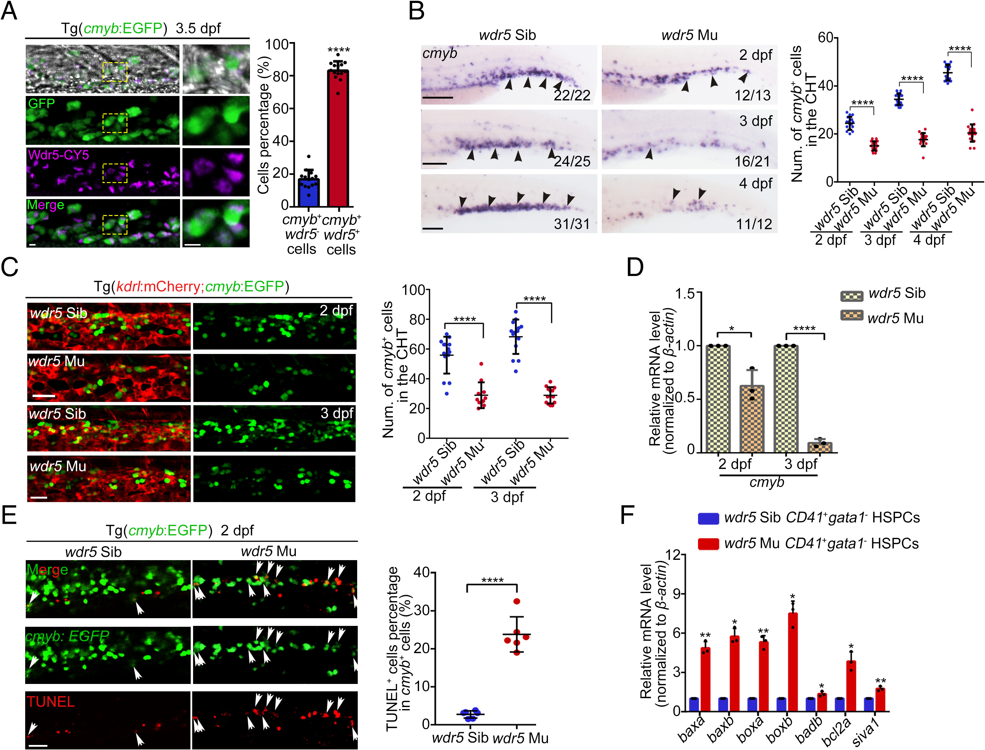 Fig. 1 wdr5 is required for HSPC survival in the CHT region. (A) IF (Left) and statistical data (Right) showing the expression pattern of Wdr5 protein in Tg(cmyb:EGFP). The yellow boxes (enlarged views shown in the right side) denote Wdr5 signal colocalization in the cmyb+ HSPCs. Error bar, mean ± SD, ****P ≤ 0.0001. (Scale bar, 5 μm). (B) WISH (Left) and statistical data (Right) showing the expression of cmyb in the CHT region of siblings and wdr5 mutants at 2 dpf, 3 dpf, and 4 dpf. The black arrowheads denote cmyb+ HSPCs. Error bar, mean ± SD, ****P < 0.0001. (Scale bar, 100 μm). (C) Confocal imaging (Left) and statistical data (Right) showing cmyb+ HSPCs in the CHT region from siblings and wdr5 mutants with Tg(kdrl:mCherry;cmyb:EGFP) background at 2 dpf and 3 dpf. Error bar, mean ± SD, ****P ≤ 0.0001. (Scale bar, 20 μm). (D) qRT-PCR showing the expression of cmyb in the CHT region of siblings and wdr5 mutants at 2 dpf and 3 dpf. n = 3 replicates. Error bar, mean ± SD, *P = 0.0346, ****P = 0.0001. (E) TUNEL (Left) and statistical data (Right) showing the apoptotic cmyb+ cells (white arrowheads) in the CHT region from siblings and wdr5 mutants with Tg(cmyb:EGFP) background at 2 dpf. Error bar, mean ± SD, ****P ≤ 0.0001. (Scale bar, 50 μm). (F) qRT-PCR showing the expression of baxa, baxb, boxa, boxb, badb, bcl2a, and sival in the CD41+gata1− HSPCs from the CHT region of siblings and wdr5 mutants with Tg(CD41:GFP; gata1:dsRed) background at 2.5 dpf. Error bar, mean ± SD, *P ≤ 0.05, **P ≤ 0.01.
