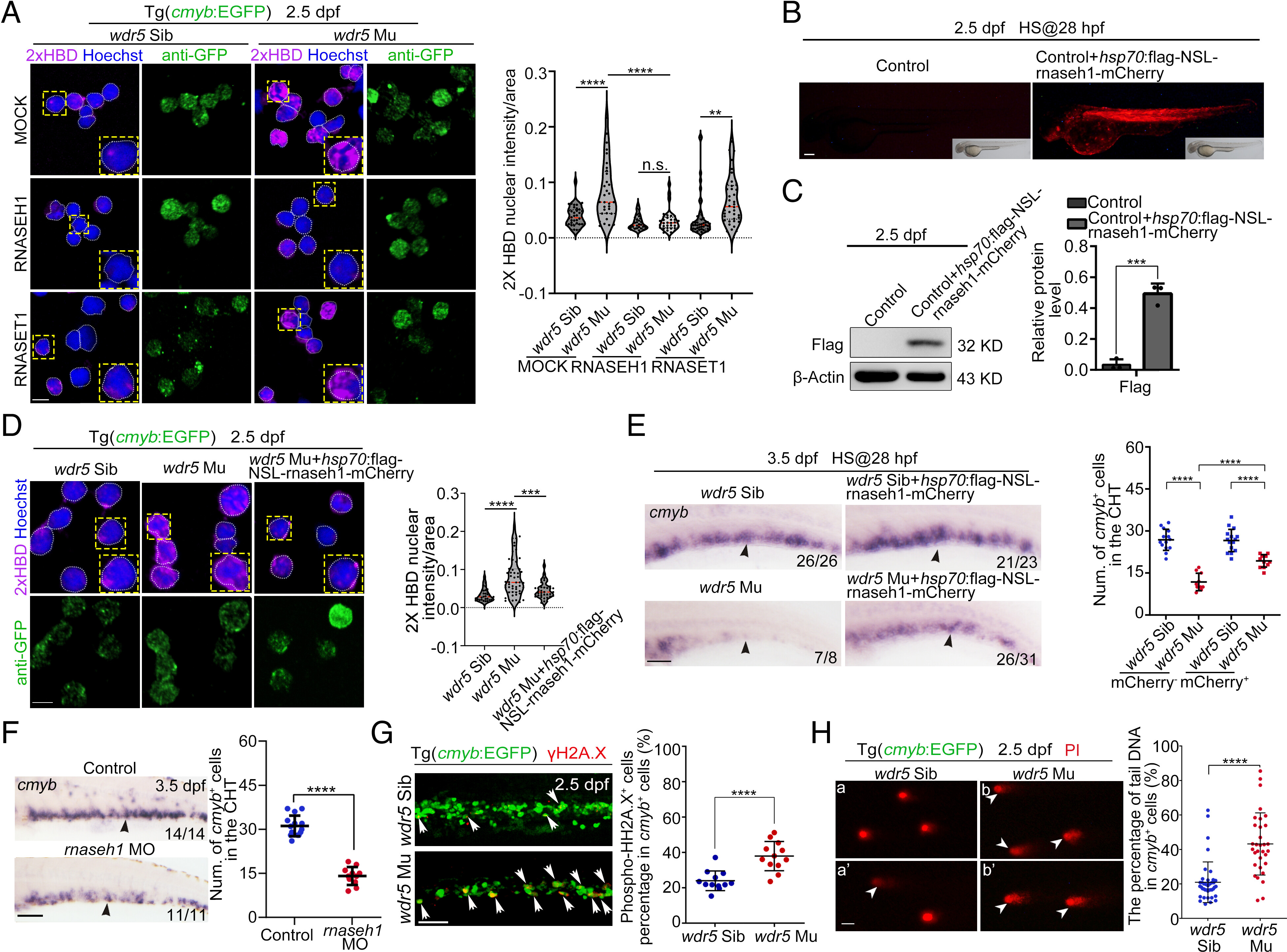 Fig. 4 Wdr5 loss facilitates aberrant R-loops accumulation and further leads to DNA damage. (A) IF (Left) and statistical data (Right, n > 30) showing the signals of 2xHBD in HSPCs of siblings and wdr5 mutants with Tg(cmyb:EGFP) background. Cell smears were mock-treated or pretreated with RNase H1 and RNase T1 for 1 h at 37 °C after blocking, and prior to 2×HBD staining. Error bar, mean ± SD, n.s.: no significance, **P ≤ 0.01, ****P ≤ 0.0001. (Scale bar, 5 μm). (B) The imaging of mCherry fluorescence in control and embryos injected with hsp70:flag-rnaseh1-mCherry plasmids at 2.5 dpf. (Scale bar, 200 μm). (C) Western blotting (Left) and statistical data (Right) showing the level of Flag-Rnaseh1 protein in the CHT region of control and embryos injected with hsp70:flag-rnaseh1-mCherry plasmids at 2.5 dpf. rnaseh1 driven by hsp70 promoter were induced by heat shock at 28 hpf. Error bar, mean ± SD, ***P≤ 0.001. (D) IF (Left) and statistical data (Right, n > 32) showing the signals of 2×HBD in the HSPCs of siblings, wdr5 mutants, and wdr5 mutants injected with hsp70:flag-rnaseh1-mCherry plasmids at 2.5 dpf. Error bar, mean ± SD, ***P ≤ 0.001, ****P ≤ 0.0001. (Scale bar, 5 μm). (E) WISH (Left) and statistical data (Right) showing the expression of cmyb (black arrowheads) in the CHT region of siblings, wdr5 mutants, siblings injected with hsp70:flag-rnaseh1-mCherry plasmids and wdr5 mutants injected with hsp70:flag-rnaseh1-mCherry plasmids at 3.5 dpf. Error bar, mean ± SD, ****P ≤ 0.0001. (Scale bar, 100 μm). (F) WISH (Left) and statistical data (Right) showing the expression of cmyb (black arrowheads) in the control embryos and rnaseh1 morphants at 3.5 dpf. Error bar, mean ± SD, ****P ≤ 0.0001 (Scale bar, 100 μm). (G) IF (Left) and statistical data (Right) showing the signals of γH2AX (white arrowheads) in the CHT region of siblings and wdr5 mutants with Tg(cmyb:EGFP) background at 2.5 dpf. Error bar, mean ± SD, ****P ≤ 0.0001. (Scale bar, 50 μm). (H) Alkaline comet assay (Left) and statistical data (Right) showing the level of DNA damage in cmyb+ cells (white arrowheads) in the CHT region of siblings and wdr5 mutants with Tg(cmyb:EGFP) background at 2.5 dpf. Error bar, mean ± SD, ****P ≤ 0.0001. (Scale bar, 20 μm).