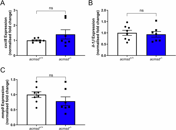 qPCR data suggested that genotype had no effect on the expression of cxcl8 (A, p = 0.9551, Mann Whitney test), il-1β (B, p = 0.7081, two-tailed unpaired t test), or mmp9 (C, p = 0.2200, two-tailed unpaired t test). n = 7 replicates for acmsd-/-; 8 replicates for acmsd+/+ (15 larvae per replicate).