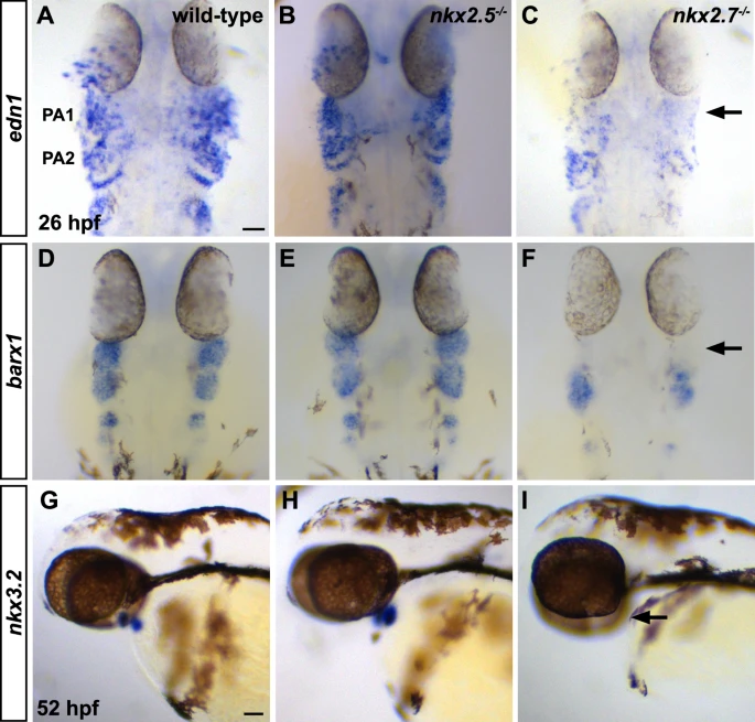 Fig. 8 Nkx2.7 is required for dorsal-ventral patterning of PA domains. A–F ISH for edn1 and barx1 at 26 hpf demonstrates decreased expression of each respective ventral gene in PA1 of nkx2.7−/− (n = 17 and 13, respectively) compared to wild-type (n = 26 and 22, respectively) and nkx2.5−/− (n = 11 and 11, respectively) embryos. Black arrows point to significantly diminished expression of each gene in PA1. Dorsal views, anterior to the top. Scale bar, 50 μm. G–I nkx3.2 is expressed in the first arch mesenchyme and pharyngeal endoderm in wild-type (n = 34) and nkx2.5−/− (n = 24) embryos at 52 hpf. However, its expression is eradicated in the pharyngeal arches of nkx2.7−/− embryos (n = 20). Black arrow points to significantly diminished expression in PA1. Lateral views, anterior to the left. Scale bar, 50 μm.