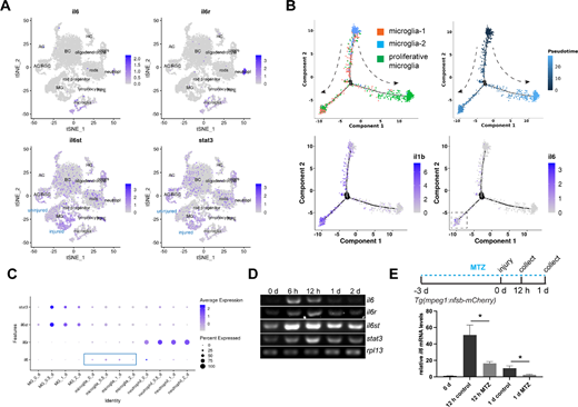 Fig. 1 Expression of the IL-6 signaling components in control and stab-injured zebrafish retinas. (A) Single-cell RNAseq analysis showing the expression of il6, il6r, il6st, and stat3 in adult zebrafish retina. (B) Pseudotime analysis showing the expression of il6 and il1b during microglia status transition. The dashed arrows show the direction of the status transition. (C) Dotplot showing the expression of IL-6 signaling component genes in MG, microglia, and neutrophil. (D) PCR analysis showing the expression of il6, il6r, il6st, stat3, and house-keeping gene rpl13 at the indicated time points in zebrafish retina. (E) Microglia ablation using the Tg(mpeg1:nsfB-mCherry) transgenic zebrafish combined with metronidazole (MTZ) treatment abolished injury-dependent retinal il6 expression at 12 hpi and 1 dpi, as shown by qPCR. *, P < 0.05. AC, amacrine cells; BC, bipolar cells; HC, horizontal cells; MG, Müller glia; MTZ, metronidazole; RGC, retinal ganglion cells; RPE, retinal pigment epithelium; tSNE, t-Distributed Stochastic Neighbor Embedding.