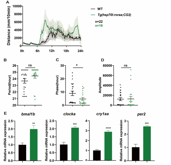 Fig. 5 Whole-body overexpression of roraa disrupts the behavioral rhythms of zebrafish. A Activity change curves for WT and Tg(hsp70 l;CG2) after heat shock at 37 °C. B–D Analysis results of the period, phase, and amplitude. The R package MetaCycle was used for rhythmic analysis of the behavior data, and there were no significant differences in the activity period between WT and roraa−/−; however, the activity phase of roraa−/− zebrafish was advanced by approximately 5 h, and the activity amplitude was significantly lower than that of WT zebrafish. E Changes in the expression of the core clock genes bmal1b, clock1a, cry1aa, and per2 in WT and Tg(hsp70 l;CG2) after heat shock at 37 °C. The black curve represents activity changes in WT, whereas the green curve represents activity changes in Tg(hsp70 l;CG2). The method for difference analysis was Student's t test; ns indicates p > 0.05, * indicates p < 0.05