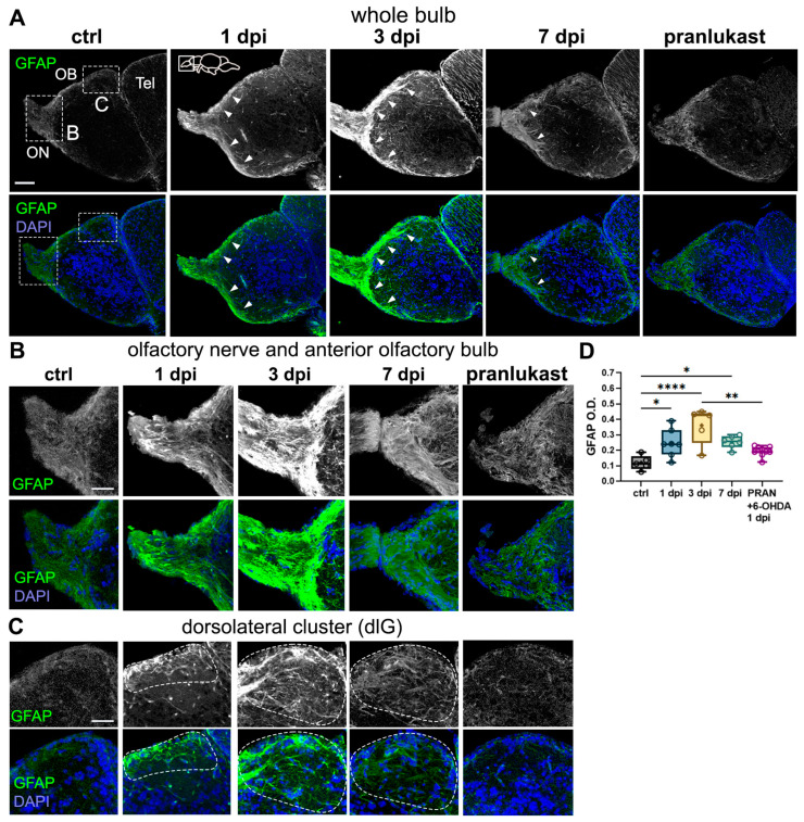 6-OHDA injections lead to astroglial activation in the OB. (AC) Glial fibrillary acidic protein (GFAP) immunohistochemistry in sagittal sections of the OB from controls, 1 dpi, 3 dpi, 7 dpi, and 6-OHDA with the anti-inflammatory drug pranlukast (PRAN). Whole bulb (A) and magnified views of: (B) the olfactory nerve and anterior OB, and (C) the dorsolateral (dlG) glomerular cluster (indicated by dotted lines). GFAP+ staining along the olfactory nerve layer (ONL) is indicated with white arrowheads. Green: GFAP; blue: DAPI. Scale bars: 100 µm in (A); 50 µm in (B,C). (D) Quantification of GFAP O.D. in OB sections from (A) (n = 5–9). ANOVA: F (4, 27) = 8.478, p = 0.0001. ctrl vs. 1 dpi p = 0.0306, ctrl vs. 3 dpi p < 0.0001, ctrl vs. 7 dpi p = 0.0275. 1 dpi vs. 3 dpi p < 0.0001. 3 dpi vs. PRAN p = 0.0017. Box plots indicate mean (+), quartiles (boxes) and range (whiskers). One-way ANOVA, * p < 0.005, ** p < 0.001, **** p < 0.0001.