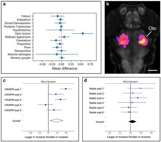 Fig. 9 Srrm4 G0 crispants display a reduced optic tectum neuropil phenotype not observed in stable mutants. a) Plot showing the mean percent size difference between crispant and control larvae within major brain divisions at 6 dpf. b) Dorsal view of maximum intensity projection of voxels showing a significant reduction in volume in srrm4 G0 crispant larvae at 6 dpf based on cluster analysis (fire). Gray staining shows pan-neuronal expression of elavl3. Anterior is to the top. Otn, optic tectum neuropil. Scale bar = 100 μm. c, d) Forest plots depicting random model meta-analyses of srrm4 morphometry experiments. c) srrm4 G0 crispant experiments and (d) and srrm4 stable mutant experiments. Details of conditions for each experiment are provided in Table 1.