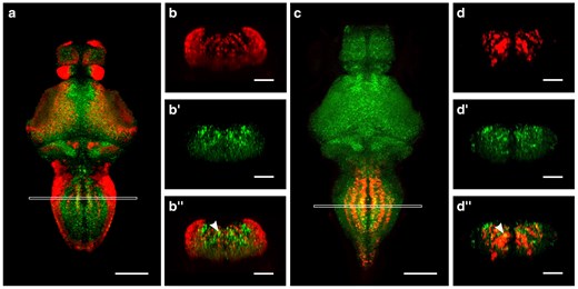 Fig. 4 Srrm4 partially co-localizes with glutamatergic and glycinergic neuron markers in the medulla. a–b″) srrm4 mRNA and vglut2a:GFP transgene expression at 4 dpf. a) Dorsal view of single plane image showing srrm4 and vglut2a:GFP expression (5 brains averaged). The white box indicates the area of maximum intensity projection shown in (b–b″) from a single representative brain. Coronal views of vglut2a:GFP (b), srrm4 (b′), and vglut2a:GFP and srrm4 merged (b″). c–d″) srrm4 mRNA and glyt2 expression at 4 dpf. c) Dorsal view of single plane image showing srrm4 and glyt2 expression (5 brains averaged). The white box indicates the area of maximum intensity projection shown in (d–d″) from a single representative brain. Coronal views of glyt2 (d), srrm4 (d′), and glyt2 and srrm4 merged (d″). Scale bars in (a) and (c) = 100 μm. Scale bars in (b–b″) and (d–d″) = 50 μm. Arrowheads point to examples of co-localization.