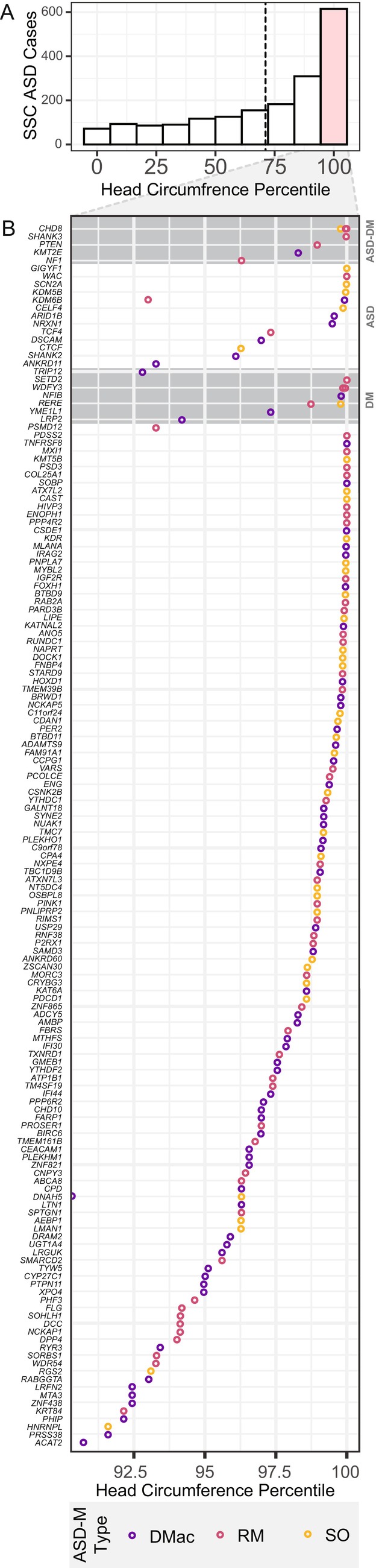 Macrocephaly level of candidate ASD‐DM and ASD‐M genes. (A) A histogram representing the number of SSC probands v. head circumference percentiles shows a skew toward larger head‐sizes compared to age‐ and sex‐matched typically developing children. The red bar designates those meeting the criteria for macrocephaly. The dashed line represents the distribution mean. (B) ASD‐DM and ASD‐M genes listed by their identified proband's head circumference percentiles show genes previously associated with ASD‐DM (first gray quadrant) are more likely to be associated with a higher head circumference percentiles than genes previously associated with autism (second white quadrant) and DM (third gray quadrant) alone. Color represents the macrocephaly type. DMac, disproportionate macrocephaly; RM, relative macrocephaly; SO, somatic overgrowth.