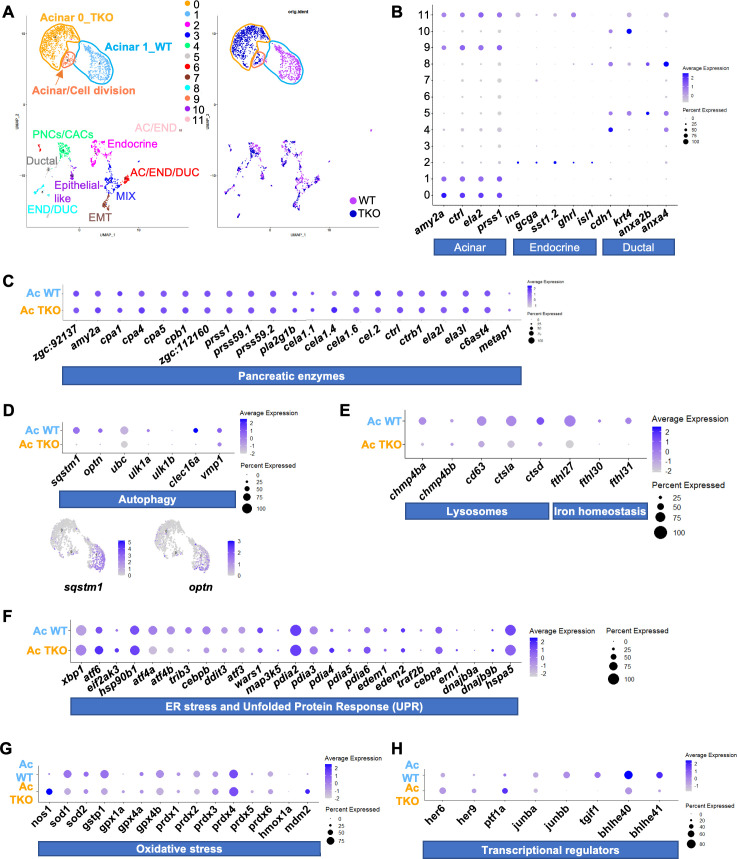 +cells.(A) (Left) UMAP showing clustering of merged WT and TKO GFP+ datasets. Each cluster identity has been annotated in the plot. Acinar cell clusters have been highlighted. (Right) UMAP displaying the projection of the two genotypes (WT and TKO) merged for the analysis. (B) Dot plots showing the expression of acinar, endocrine and ductal gene markers in merged WT and TKO datasets as shown in (A). (C) Dot plot showing the expression of the pancreatic proteins found downregulated in the proteomic analysis of 5 dpf WT and TKO embryos. (D) (Top) Dot plot showing expression of genes involved in autophagy in TKO and WT acinar cell (Ac) clusters. (Bottom) feature plots depicting the expression level of specific autophagic markers in acinar cell clusters as shown in (A) (purple is high, gray is low). (E-G) Dot plot showing expression in TKO and WT acinar cell (Ac) clusters of genes involved in different cellular processes: lysosomes and iron homeostasis (E), ER stress and UPR (F) and oxidative stress (G). (H) Dot plot showing examples of genes differentially expressed in TKO and WT acinar cells at 4 dpf. In each dot plot, the size of the dots encodes the percentage of cells within a class, the color indicates the average level of expression (purple is high, grey is low). Graphics in S4A Fig were created with BioRender.com.
