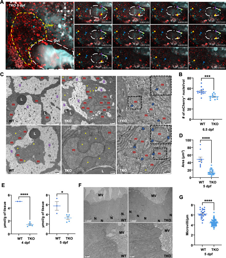 (A) (Left) Representative max-projection of confocal Z-stacks of a FUCCI TKO embryo at 5 dpf. The dashed yellow and white lines highlight the left lobe liver and the gut, respectively. Lateral views, anterior to the left and dorsal to the bottom. Scale bar, 20 μm. (Right) Pictures of the same single plane over time from each confocal Z-stack. For clarity, only the gut region is highlighted with a white long-dashed dot line. Arrowheads point at the same cerulean+ cells over time. Numbers indicate the time of each frame; each hour the timer is restarting from zero. (B) Quantification of the number of G0/G1 nuclei per volume (39µm3) in the left lobe of the liver of WT and TKO at 6.5 dpf. (C) Representative EM pictures showing subcellular organization of hepatocytes in 5 dpf WT and TKO embryos. Different grades of severity have been observed in TKO hepatocytes. Dashed black rectangles highlight the insets. m, mitochondria, L, lipid droplets, g, glycogen lacunae, yellow asterisks mark the peroxisomes. Blue arrows point to mitochondria showing signs of distress (intracristal swelling and blistering of the external membrane). Specific scale bars are indicated for each picture. (D-E) Quantitative analysis of glycogen content in WT and TKO at different stages. (D) Analysis performed using ImageJ (Fiji) on EM images at the same magnification from WT and TKO at 5dpf. (E) Glucose content (μmol/grams of embryonic tissue) quantification after amyloglucosidase digestion in WT and TKO embryos at 4 and 5 dpf. (F) Representative EM pictures comparing gut epithelial cells in WT and TKO 5 dpf embryos. Scale bars, 4 μm (top) and 1 μm (bottom). N, nucleus, MV, microvilli. (G) Quantification of the microvilli density (# of microvilli/µm) in 5 dpf WT and TKO gut epithelial cells. The data represent means ± SEM. Statistical significance was determined by unpaired two-tailed t-tests. * < 0.05, *** < 0.001 and **** < 0.0001.