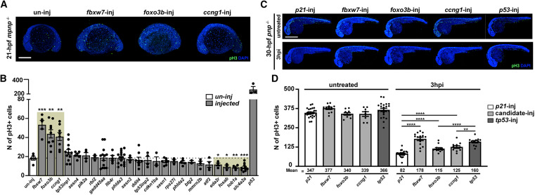 Fig. 7 fbxw7, foxo3b and ccng1 G0 crispants mitigate p53-mediated cell-cycle arrest (A) Representative images showing pH3-stained un-injected (control, un-inj) and injected mpnp−/− embryos at 21 hpf. Scale bar: 250μM. (B) Quantification of pH3 positive cells in injected mpnp−/− embryos for 24 GOIs. un-inj (negative control) and the p53 guides-injected (p53, positive control). (C) Representative images representing pH3-stained, IR-irradiation treated or untreated, four-guide injected pnp−/− embryos at 30 hpf. Scale bar: 500μM. (D) Quantification of pH3 positive cells in injected pnp−/− embryos for fbxw7, foxo3b and ccng1. p21-inj (negative control) and p53-inj (positive control). Each dot represents an individual. Bars represent mean ± SEM. ∗, p < 0.05. ∗∗, p < 0.01.∗∗∗, p < 0.001.∗∗∗∗, p < 0.0001.